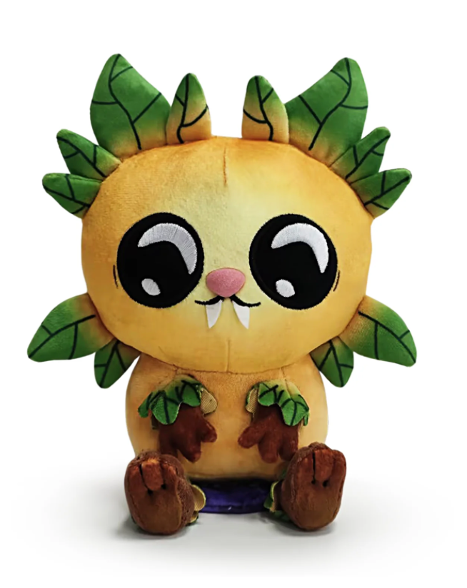 Don't let his slightly scary appearance frighten you, this cutie is non-hostile and is so down for an adventure! Pipsqueak is right out of Oxygen Not Included and is ready to sit on your shoulder for an adventure! This 6 inch tall shoulder rider has golden beige fur with accents of green leaves that extend from its face, arms and legs, while large worried black eyes sit overtop of a downturned mouth that has two sharp white teeth poking through. With a face framed by green leaves that circle it's head, this cutie sit with their brow feet kicked forward as short hands rest on their stomach. This plushie is made of a mixture of felt, normal and sublimated minky materials, is packed to the seams with the most huggable squishy 100% PP cotton and comes equipped with a magnetic disc to let it perch firmly atop your shoulder as the best accessory and a true testament to your love of the fandom
