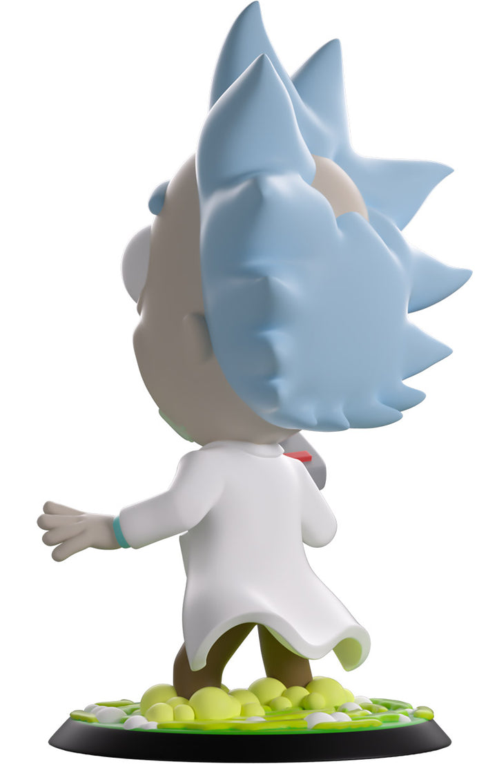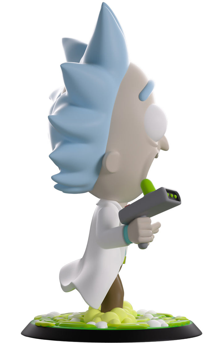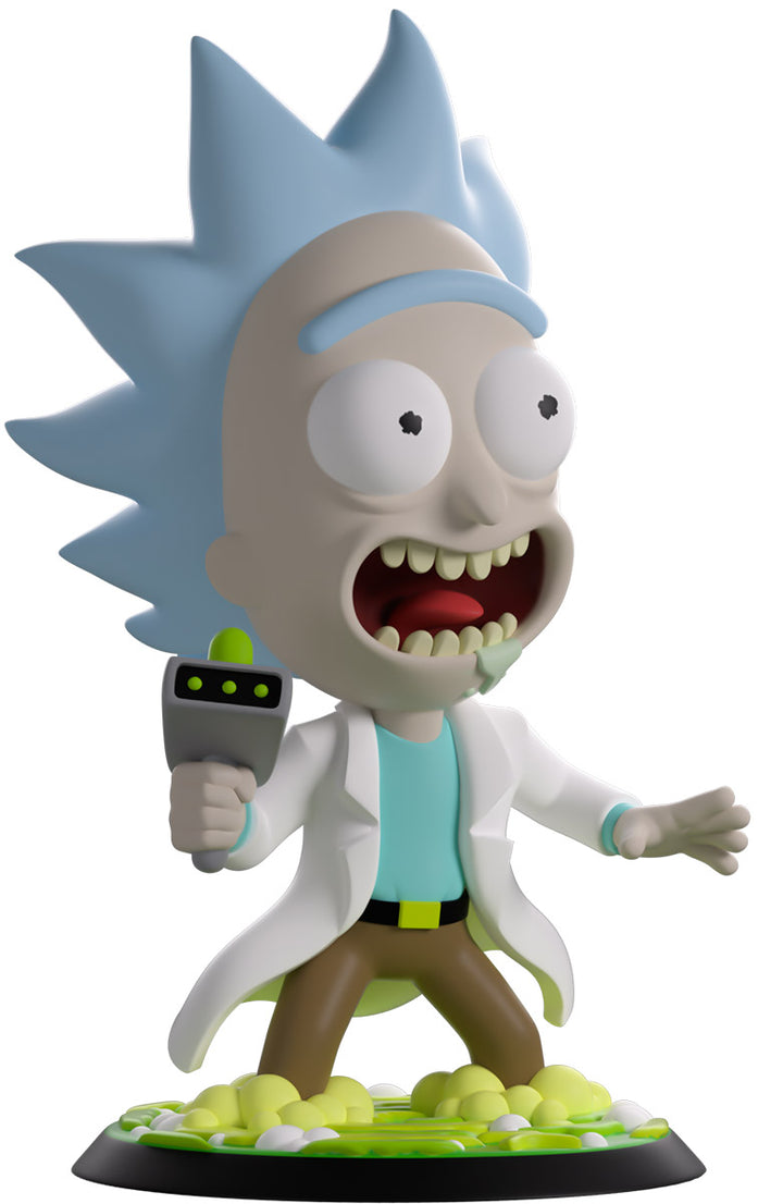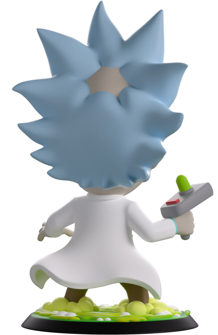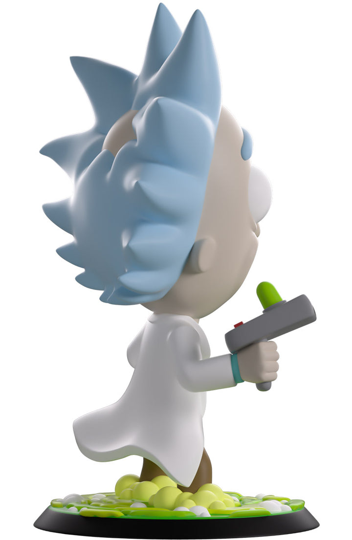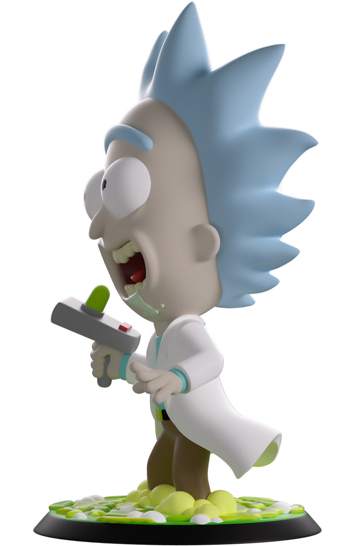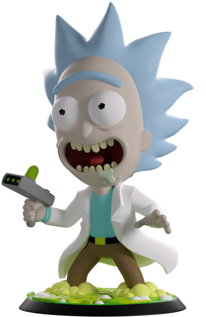 Rick portalled straight into Youtooz to cause some havoc with his debut! Standing at 5 inches tall and brandishing his trusty portal gun in a raised hand as drool seeps out from the manic open smile plastered on his face, a pair of huge round eyes bulge out from underneath a blue unibrow as spiked hair flies wildly to the sides of his balding head. Knee deep in the swirling green portal that bubbles around his feet, a white lab coat flows from his shoulders as he wears a pale blue shirt tucked into brown pants. The exterior of his packaging sees Rick and Morty flying through space. The interior is then covered in green line drawings over a black background which continue onto the protective sleeve where his figure can be seen through the large clear window at the packaging’s front. This collectible was designed in collaboration with the community member @therealracckun, ships in a matte, embossed, protective outer sleeve and a custom-sized plastic protector for maximum protection during shipping.