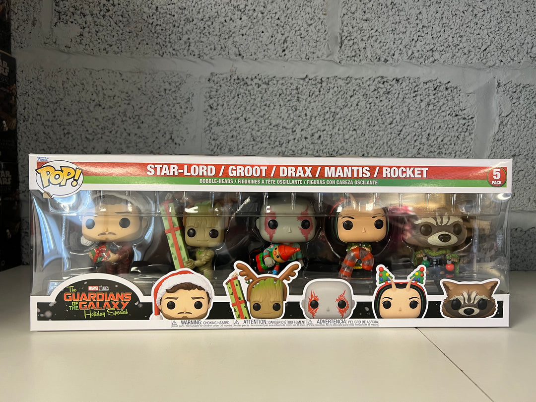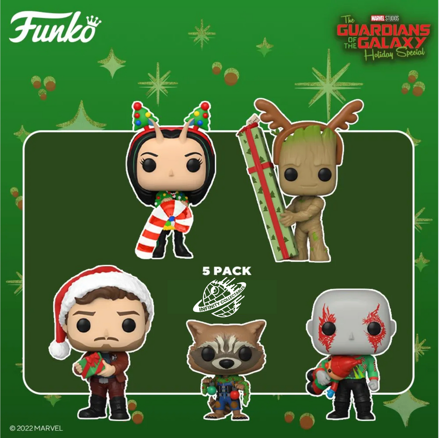 Take your holiday celebrations to cosmic new heights with The Guardians of the Galaxy Holiday Special Star-Lord, Groot, Drax, Mantis & Rocket Pop! Vinyl Figure 5-Pack from Funko!