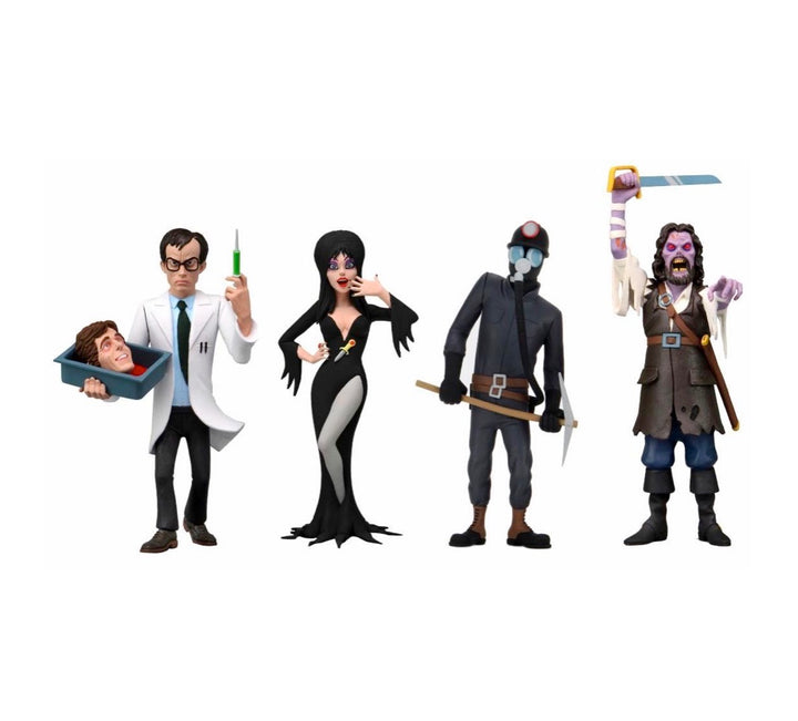Standing approximately 6 inches tall, the Series 6 action figure assortment includes the iconic Elvira (Mistress of the Dark), Captain Blake (The Fog), Herbert West (Re-Animator) with accessory tray and head, and The Miner (My Bloody Valentine) with accessory pickaxe.
