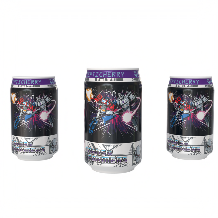 This isn't just a drink—it's a calculated strike of flavour. You get a dominant blend of sharp, authentic Cherry and smooth, dark Vanilla, creating a unique, complex taste with an insidious fizz that fuels every takeover attempt. Whether you're marshalling your forces, commanding from the Nemesis, or simply demanding the best from your day, this soda is your ultimate weapon. Every can is a collectible display of power, featuring intimidating, high-definition Megatron artwork with the same stunning, next-level finish as Primeberry.