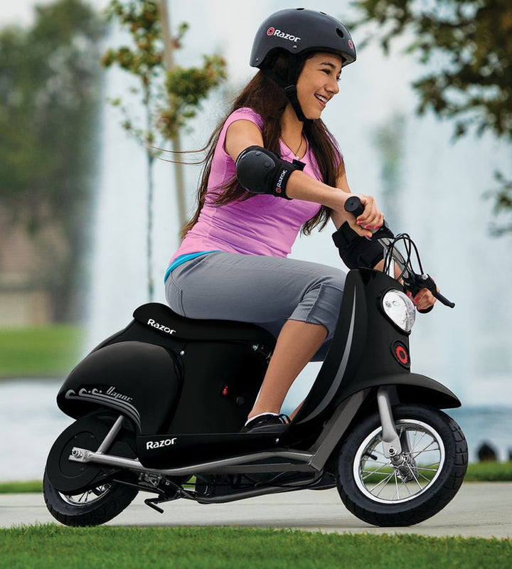 The Razor Vapour Pocket Mod Scooter Black combines classic European scooter style with modern electric power for a smooth, stylish ride. Featuring authentic details like a padded seat, twist-grip throttle, and hand-operated rear brake, this scaled-down scooter delivers speeds up to 15 mph (24 km/h) in high-speed mode, with a safer 10 mph (16 km/h) option for beginners.