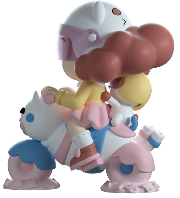 Bee and Puppycat have received their next assignment and have ridden straight to Youtooz HQ for their second vinyl figure! Zooming in at 4.4 inches tall atop the cutest motorbike around with its soft pastel pink, blue and white coloring and adorable smiling cat face at its front as a pair of long exhaust pipes stretch out from back. Bee takes the lead and grips the handlebars firmly with her puffy hair bulging out of the back of a white cat helmet that has a pair of short ears sticking up and a purple visor that rests over her face. While Puppycat rides pillion with his hands holding onto the back of Bee’s long-sleeve yellow shirt and looks over her shoulder through the visor of his bright yellow helmet. The exterior of their packaging looks over the barrier of a bridge to see a stunning sunset reflecting off shimmering blue and pink water. While the interior is a repeating pattern of colorful eggplants over a white background, this then extends onto the protective sleeve which shows their figure perfectly through the large clear display window at its front. This collectible ships in a matte, embossed, protective outer sleeve and a custom sized plastic protector for maximum protection during shipping.