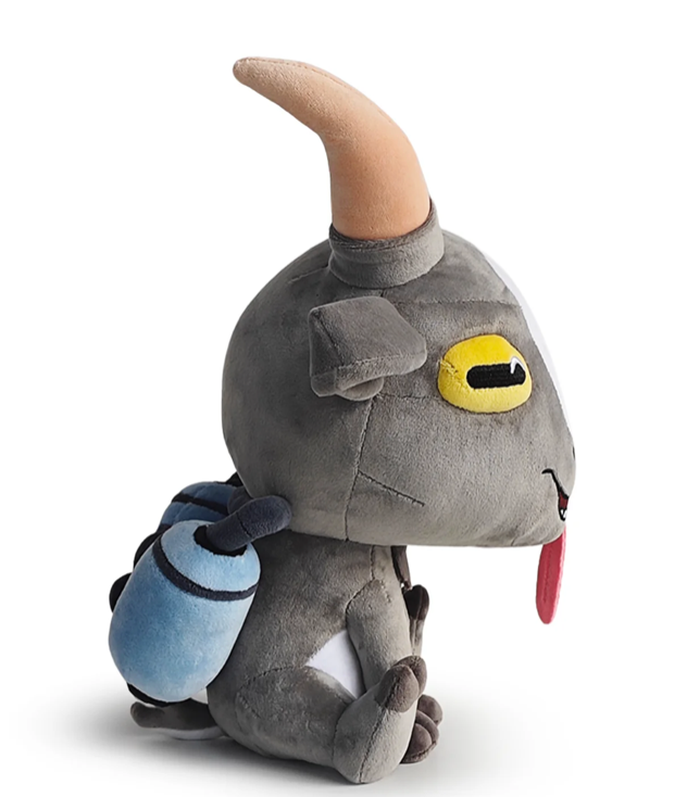 We were just chillin’ here when this goat blasted through the window and started wrecking up the place! Sitting at 9 inches tall with a long pink tongue hanging goofily from their open smiling mouth, a striking white mark runs down the middle of their face between golden yellow eyes as a pair of long horns reach out from the top of their head and folded ears stick out to each side. With their back hooves kicked forward and their front legs planted on the ground, they’re ready to blast off into whatever mischief awaits them with the dual-cylinder jetpack to their back. This plush is packed to the seams with 100% PP cotton and is made of the softest minky material, absolutely perfect for cuddling or ragdolling with!