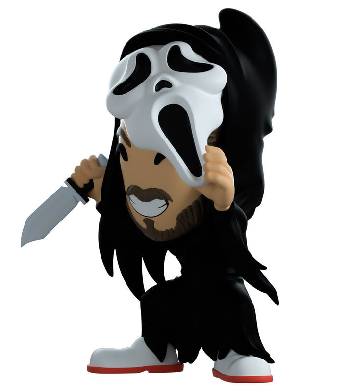 Are you ready to add to James’ kill count with his return to Youtooz?! Posed leaning forward on bent knees at 4.4 inches tall with one hand holding a gleaming knife downwards and ready to plunge into an unsuspecting victim, his other hand raises a white Ghost Face mask from his face revealing his face. With a devilish smile shining through his brown beard, a long black cloak hugs tight around his body with long jagged points flowing from his arms and over his white shoes which have bright red soles. The exterior of his packaging shows a ghastly silhouette glowing in red through the outside of a house's window. While the interior is a black background with thin red lines running across it and the ‘Dead Meat’ logo splattered on its walls, this continues onto the protective packaging where his figure can be seen through the large clear window at its front. This collectible ships in a matte, embossed, protective outer sleeve and a custom sized plastic protector for maximum protection during shipping.About Dead Meat