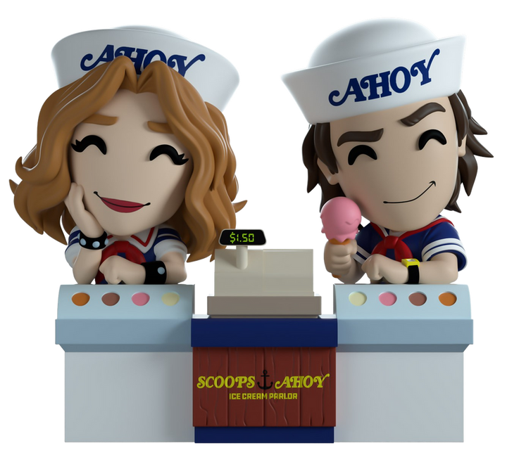 Steve and Robin are here to serve up a delicious scoop of ice cream as America’s favorite place to cool down arrives at Youtooz! At 5 inches tall, the pair lean forward with their arms resting on the top of the long ice cream cabinet and stand on either side of a beige cash register as they wear matching blue and white sailor uniforms with red neck ties and white hats with ‘ahoy’ written on the front. With a raised eyebrow and a slight smirk, Steve holds out a pink ice cream cone in his right hand while Robin’s long locks of wavy brown hair frame her smiling red lipped face which rests on her right hand. The exterior of their packaging sees the duo waiting to serve up a delicious treat within the striped walls of Scoops Ahoy, while the interior is a series of anchors over a light blue background. The protective sleeve is a light blue wave pattern over a stark white as their figure can be seen through the large clear display window at its front. This collectible ships in a matte, embossed, protective outer sleeve and a custom sized plastic protector for maximum protection during shipping.