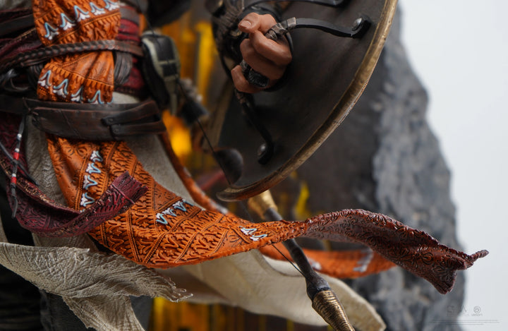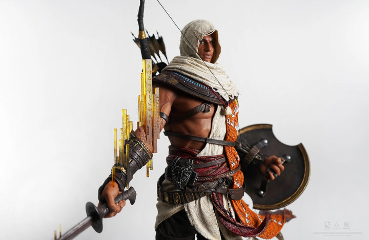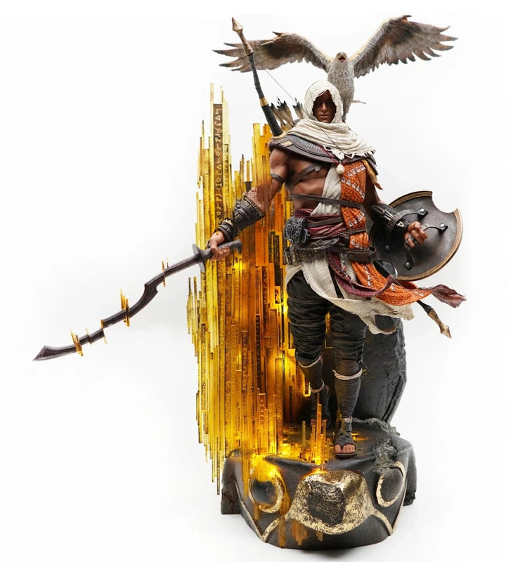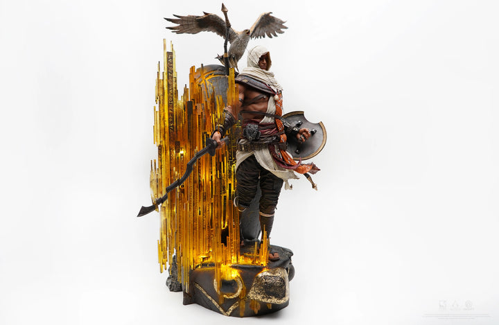 Bayek of Siwa, co-founder of the Hidden Ones, materializes from the Animus synchronization in this 1:4 scale polyresin statue, alongside his loyal eagle companion, Senu! Feel the strength of this duo amidst the abstract landscape of Egypt. Illuminate the LED lights and transport yourself into the desert with them!