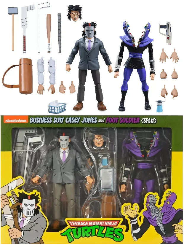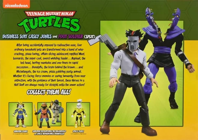 Casey Jones in his Octopus Inc. business suit disguise is here! This all-new Casey Jones sculpt is compatible with our original Casey Jones figure. He comes in an epic action figure 2-pack with the long-awaited split-in-half Foot Soldier. These action figures stand in 7-inch scale and are ready to join your collection today! Comes in collector-friendly window box packaging.