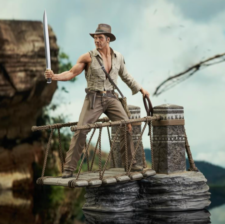 Everybody hold on! Indiana Jones has a plan, and you aren't gonna like it! Depicting Indy, machete in hand, as he crosses the rope bridge in Temple of Doom, this approximately 11 inch Gallery Diorama is made of high-quality PVC and comes packaged in a full-color window box. It features detailes sculpting and paint applications.