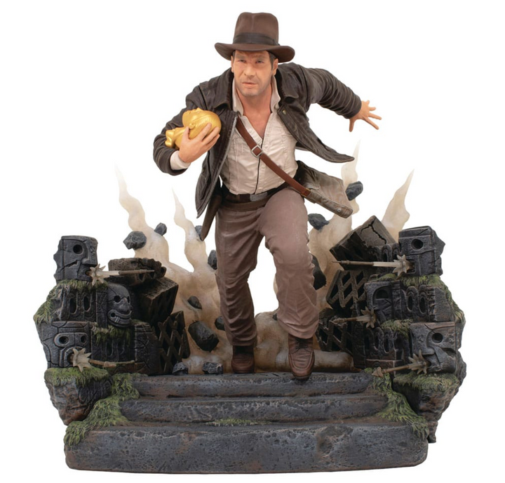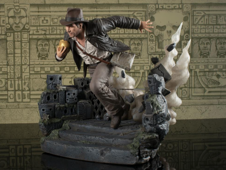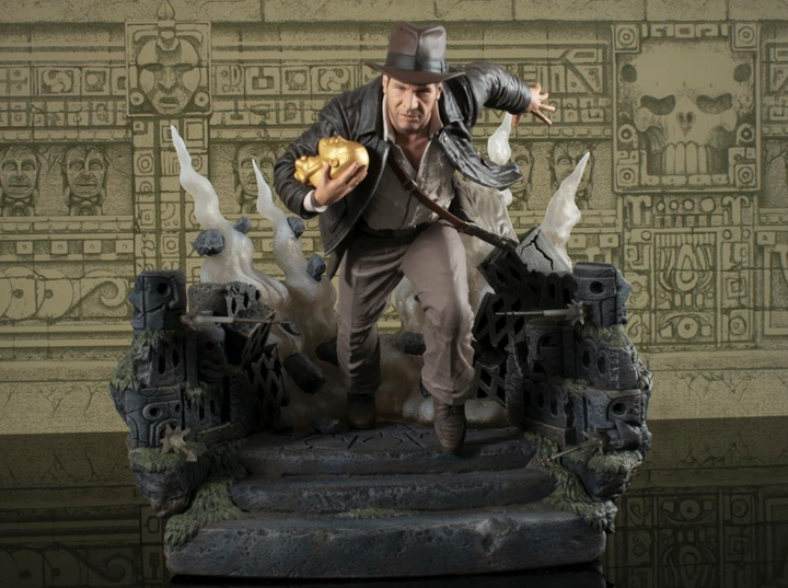 Run for your life, Indiana! Doctor Jones sprints past launching arrows, idol in hand, as a giant boulder rolls after him, destroying all in its path. Standing approximately 10 inches tall, this sculpture is made of high-quality PVC and comes packaged in a full-color window box.