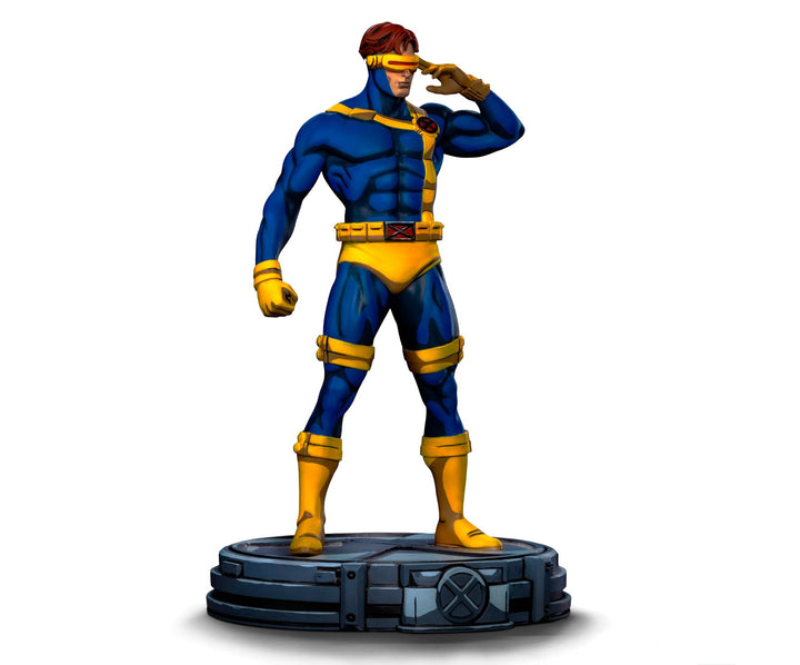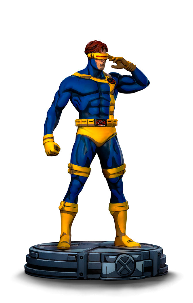 Wearing his praised costumed characteristic from the 90s, the founding member of the X-Men and field leader takes his left hand to his ruby-quartz visor, ready to project his pure power from his eyes, in the form of a controlled beam of concussive ruby-colored force. Cyclops is Scott Summers, born a mutant, he has the power to project pure energy from his eyes, and was Professor X’s first student and ally in the fight for peace and equality between humans and mutants since he joined the X-Men. Presenting innovation in his painting in the form of a specific shading that highlights all the figures from this new collection as if the characters were coming out of the TV to the real world, Iron Studios present the statue "Cyclops - X-Men '97 - Art Scale 1/10", over a themed base in the “X” shape of the logo of the super group of mutant heroes.