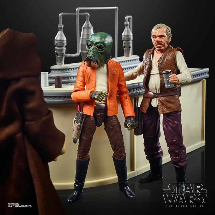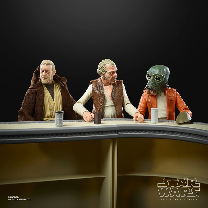 Recall intense moments from the Star Wars Galaxy with this Star Wars The Black Series The Power of the Force Lucasfilm 50th anniversary 6-inch-scale Cantina Showdown 3-figure playset, featuring Dr. Evazan, Ponda Baba, and Obi-Wan Kenobi action figures.