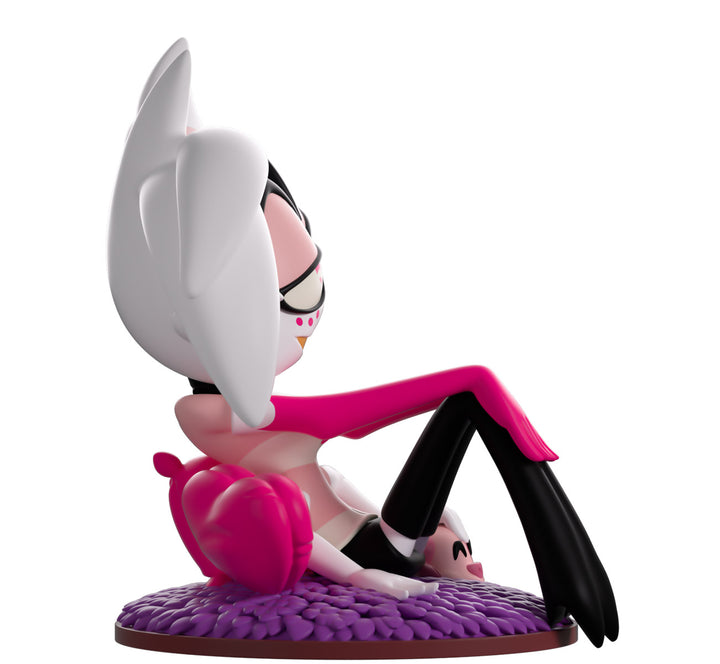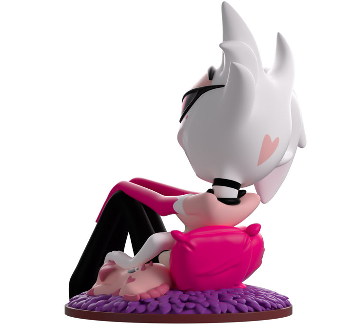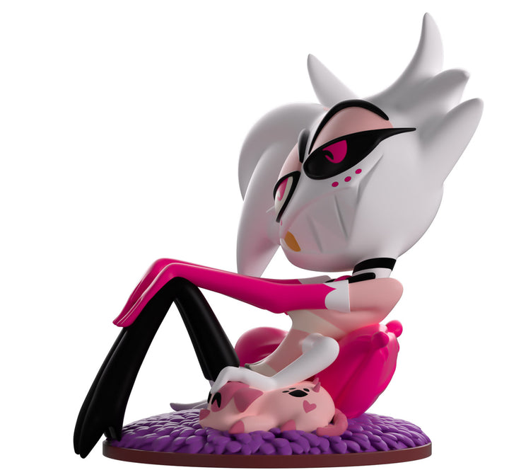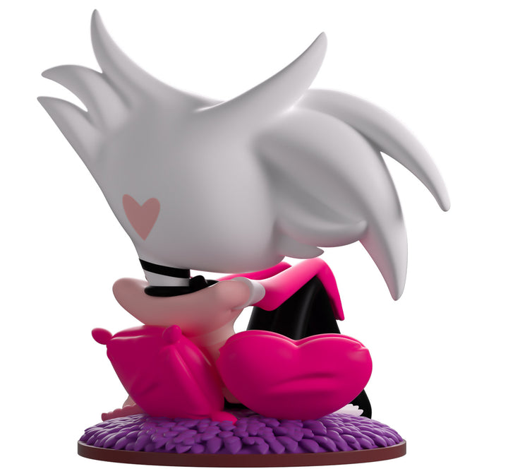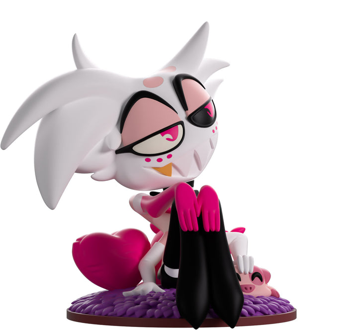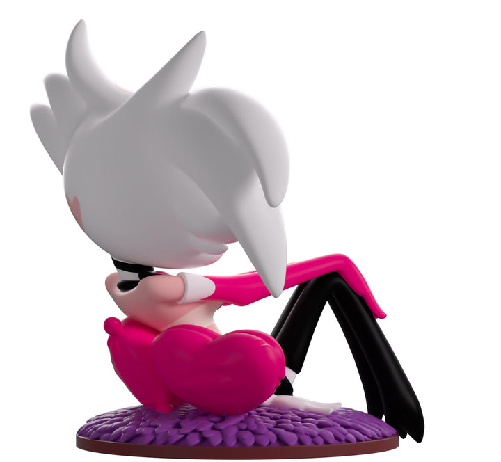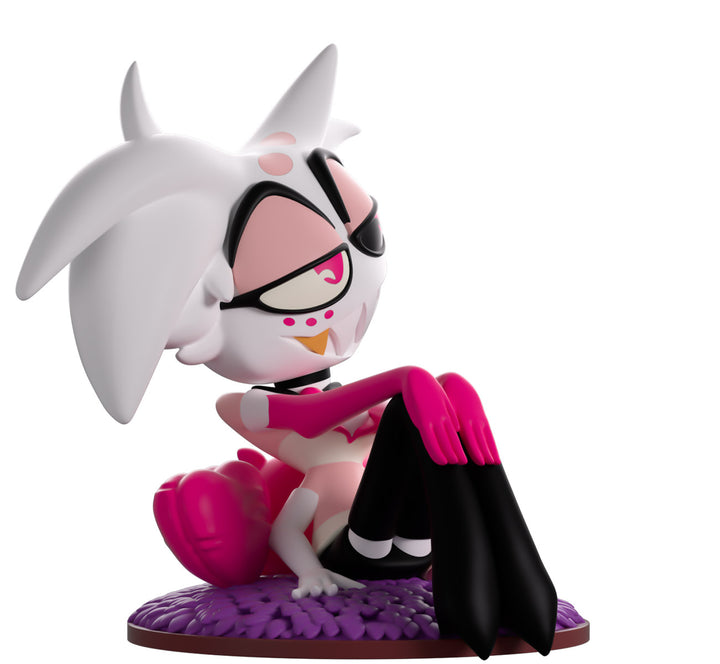 Youtooz has been graced by the presence of a true star with Angel Dust’s debut! Laying atop a deep purple rug and propped up against a pair of bright pink pillows at 3.8 inches tall, his head is cocked to the side playfully as a cheeky tooth-filled smile curves underneath sultry half-lidded white and black eyes and his thick white hair flicks to the side. With one pair of pink gloved hands outstretched and resting on raised knees, a second pair of white gloves stick out from the sides of his pink and white striped shirt to pat a sleepy fat nugget. The exterior of his packaging sees a purple, pillow-laden, bed covered in fur as strings of vibrant hearts hang from the ceiling. The interior of the box is covered in an elegant red patterned wallpaper which continues onto the protective sleeve where it turns to a deep black and shows off a dark cityscape as his figure can be seen through the large clear window at the packaging’s front. This collectible ships in a matte, embossed, protective outer sleeve and a custom-sized plastic protector for maximum protection during shipping.