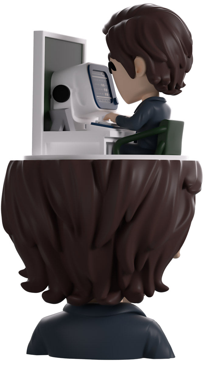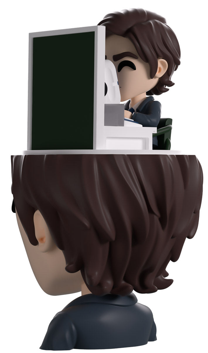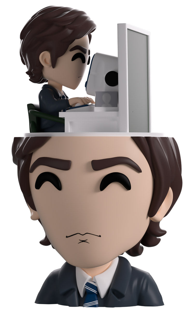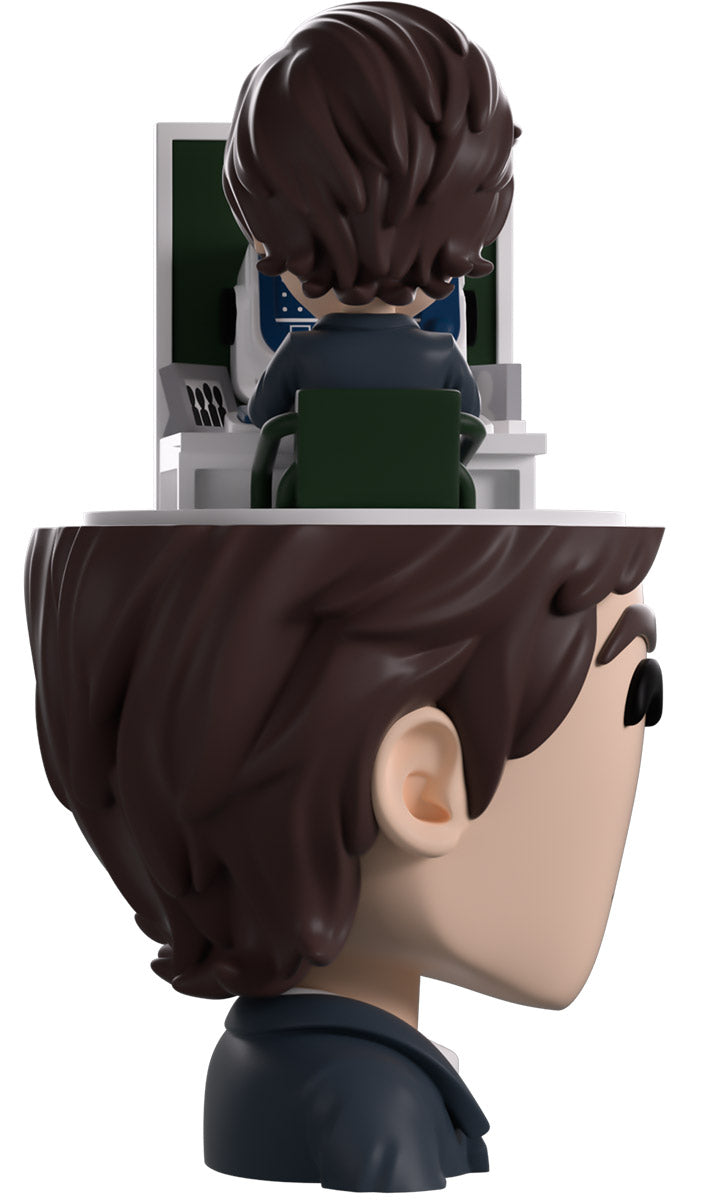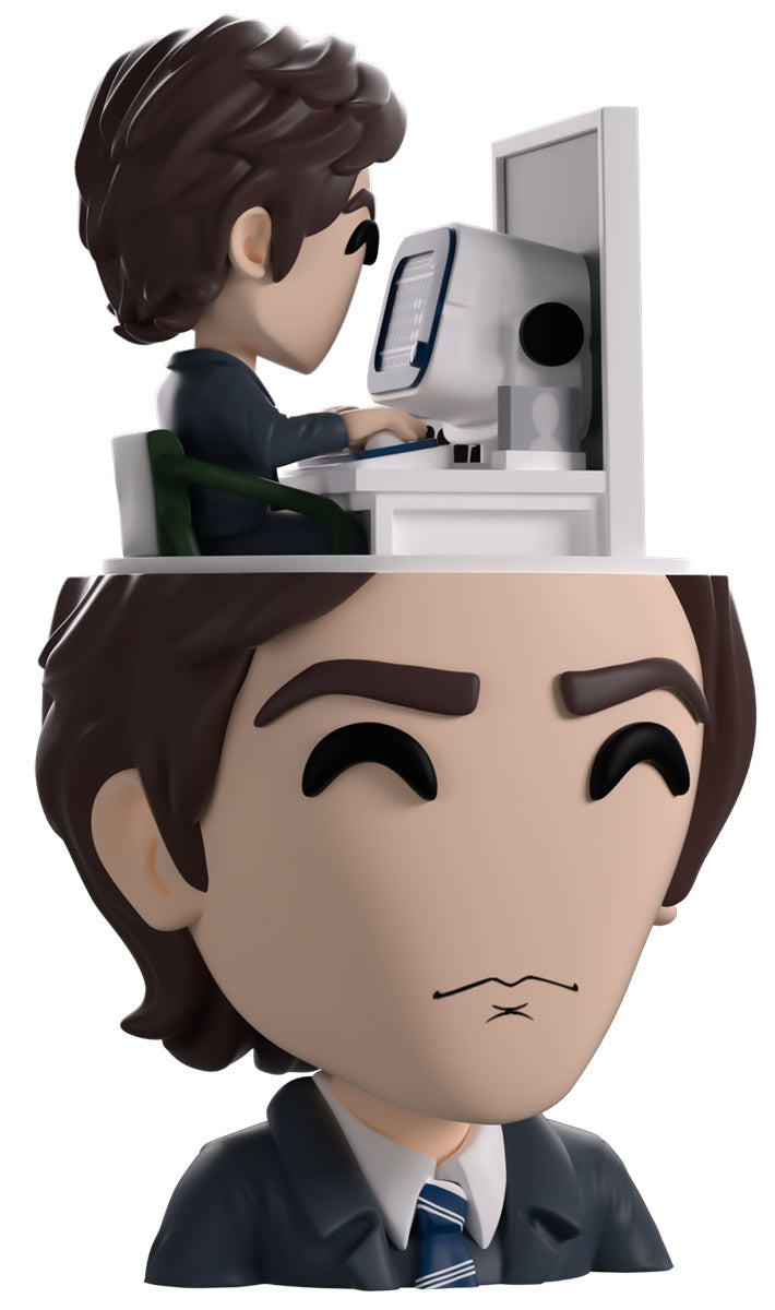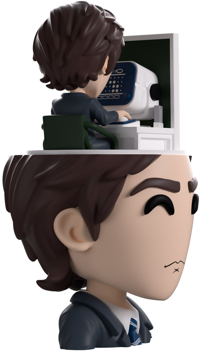 Mark’s clocked into work at Youtooz for his debut and we couldn’t ask for a better worker! At 5.1 inches tall, this figure sees a tiny Mark sitting at a desk diligently typing away at his round white computer as he does very VERY mysterious work and a deep green office partition blocks him in. Underneath him is the severed (see what we did there) head of a larger Mark, whose long brown hair is slicked back as a pensive look crosses his face and he wears a sharp blue and white suit with a striped tie. The exterior of his packaging sees a note scrawled with facts about Mark’s outie, while the interior is covered in blue numbers of a computer screen over a black background. The protective sleeve then shows off the shining silver outside of an elevator as his figure can be seen through the large clear window at the packaging’s front. This collectible was designed in collaboration with community member @therealracckun and ships in a matte, embossed, protective outer sleeve and a custom-sized plastic protector for maximum protection during shipping.