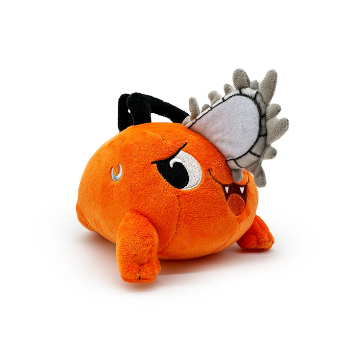 Pochita cheerily finds his way back into Youtooz and this time he’s making sure he can ‘stick’ around! With a vibrant orange body and his legs splayed out as he lays on his tummy at 6 inches long, a spiked grey chainsaw extends from his face as an open mouth reveals a pink tongue and two fangs. With worried eyes and a handle sticking out from his back and rear, a small black tipped tail raises up. With 4 sewn-in magnets he’s ready to hang with the other Pochita’s and get stuck together, or any magnetic surface for that matter! And don’t worry, when he’s not stuck to something he’s the perfect cuddle buddy, packed to the seams with 100% PP cotton and made of the softest minky material!