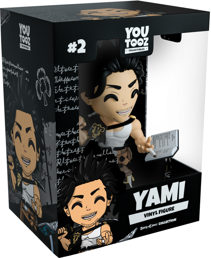 Yami, the leader of the Black Bulls, makes his Youtooz debut! At 5 inches tall he’s posed slinging a katana over his shoulders with dark magic emitting from its blade, while his open left hand holds a cigarette between two fingers. Wearing a tattered black banner with the Black Bull emblem over one shoulder, his strong muscular body is highlighted by his tight white singlet. The brown belts around his waist hold numerous pouches along with a long sword sheath and sit over brown pants that are tucked into tall black boots with a gold trim. The exterior of his packaging is a deep black and grey and is scrawled with magic texts which flow around it and through to the interior. The protective sleeve continues this motif with grey script and clover patterns over a black background, while a large clear window at its front displays Yami perfectly! This collectible ships in a matte, embossed, protective outer sleeve and a custom sized plastic protector for maximum protection during shipping.
