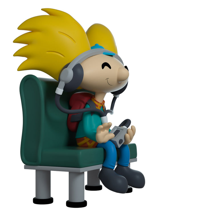 Hey! Arnold’s making his Youtooz debut! Sitting on a cushy green bus seat and jamming the sweetest tunes from the grey headset that sits over his oval head, grey wires lead down from his ears to the cassette player in his hand as the other taps away to the melody. With a smile curling up the side of his face and blue cap resting in between his iconic yellow hair, a green sweater sits over his long plaid shirt as tight blue pants lead down to large black shoes. The exterior of his packaging sees a bright blue bus illuminated by a streetlight as it drives down a city street, while the interior is an orange skyline in front of a warm sunset. The protective sleeve is a bright red brick wall as the character’s black silhouettes can be seen through colored windows. This collectible ships in a matte, embossed, protective outer sleeve and a custom sized plastic protector for maximum protection during shipping.
