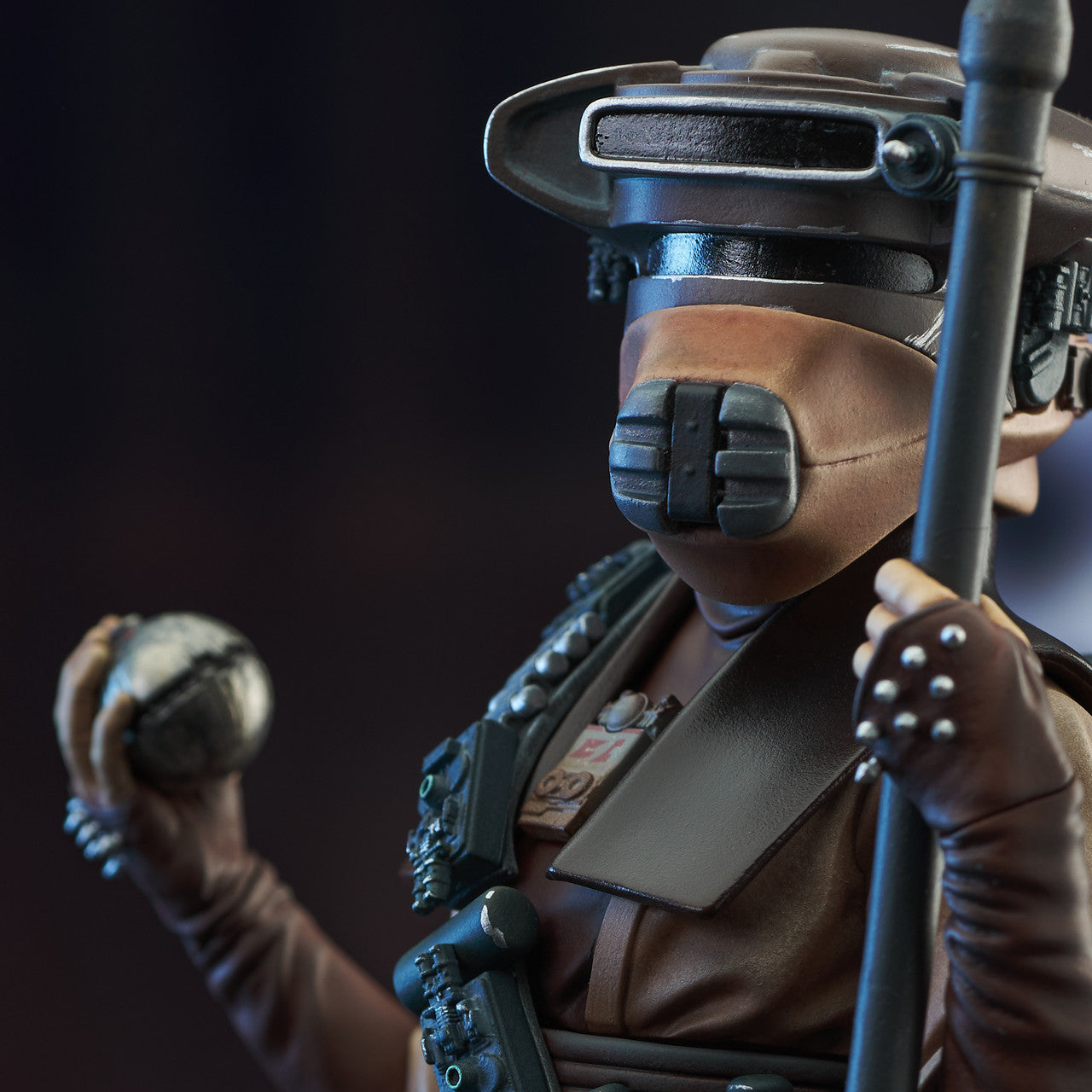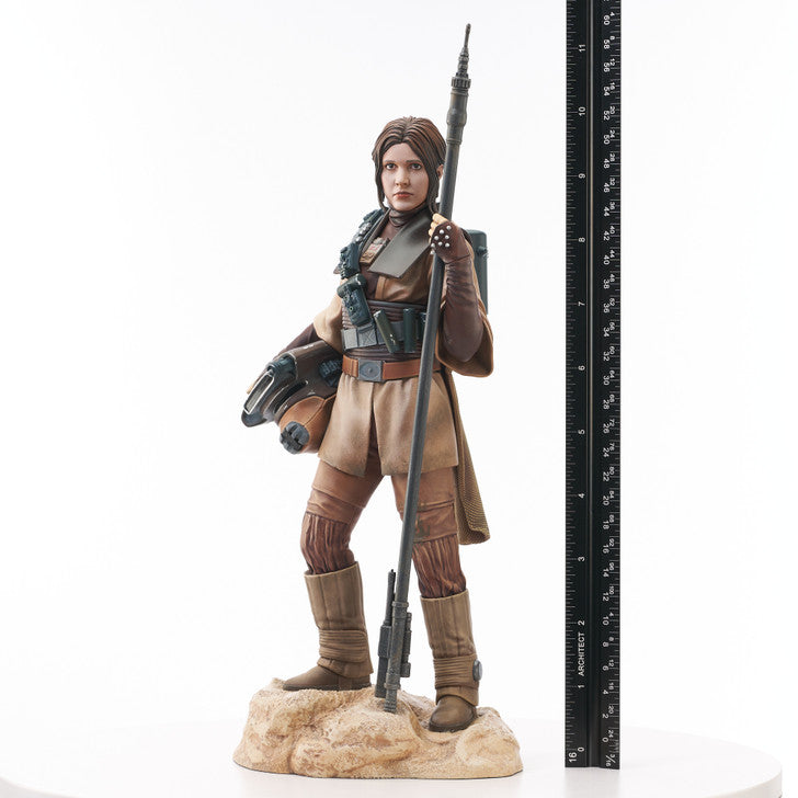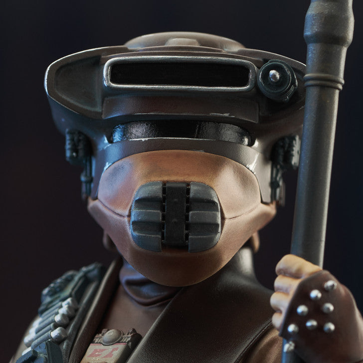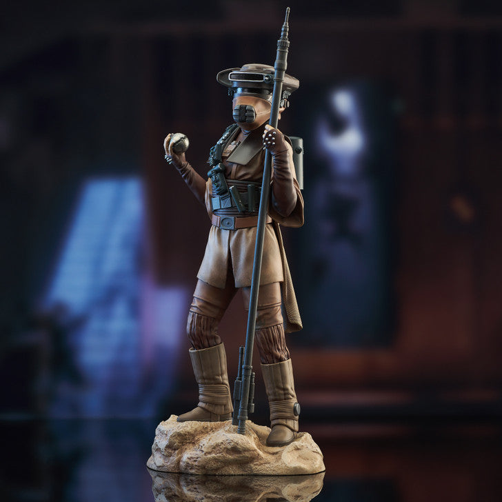 A Gentle Giant LTD release! Princess no more, Leia Organa goes undercover to rescue her true love in this all-new Star Wars statue by Gentle Giant Ltd. Disguised as Boushh, a bounty hunter, Leia holds a electro-shock lance and features an interchangeable head so she can wear or hold her helmet, and if you change out her right arm she's holding a thermal detonator! Standing approximately 10 inches tall and limited to only 3000 pieces, she comes packaged with a certificate of authenticity in a full-color box.