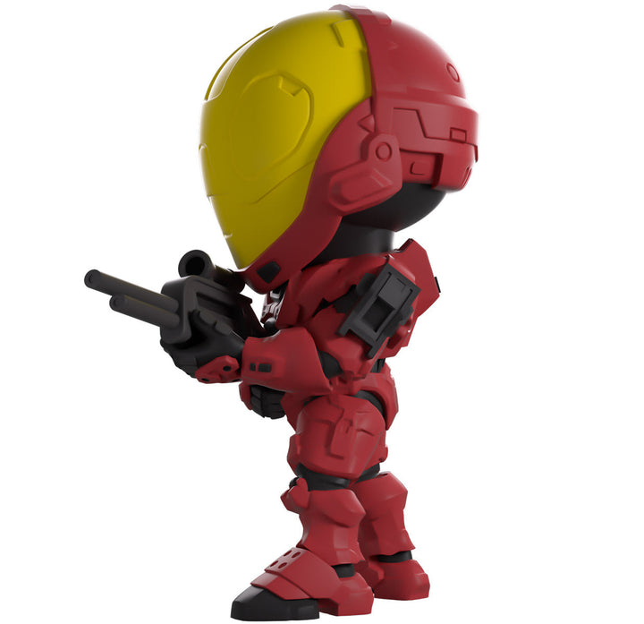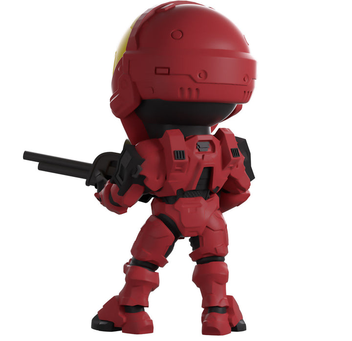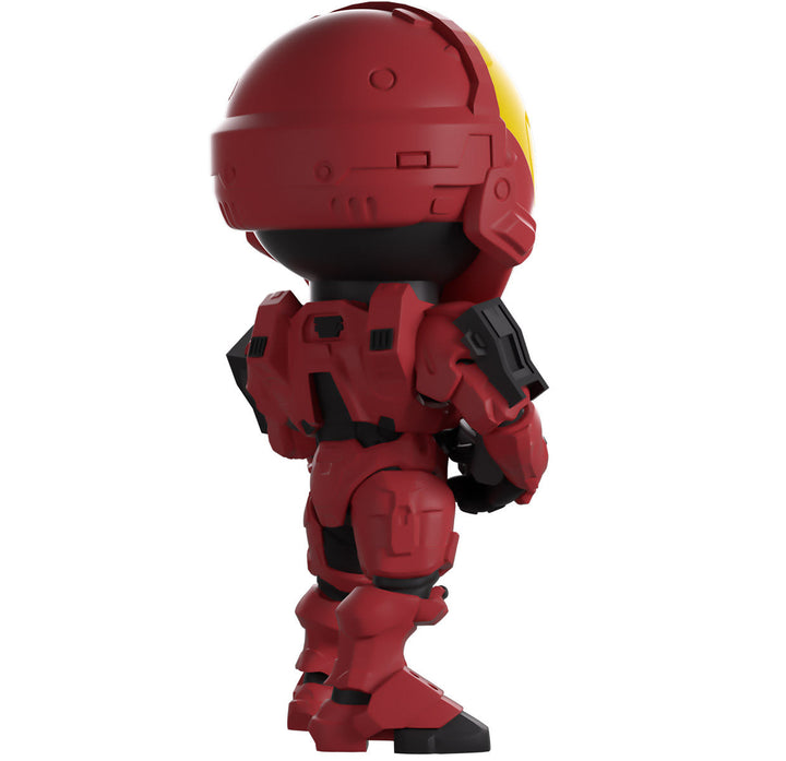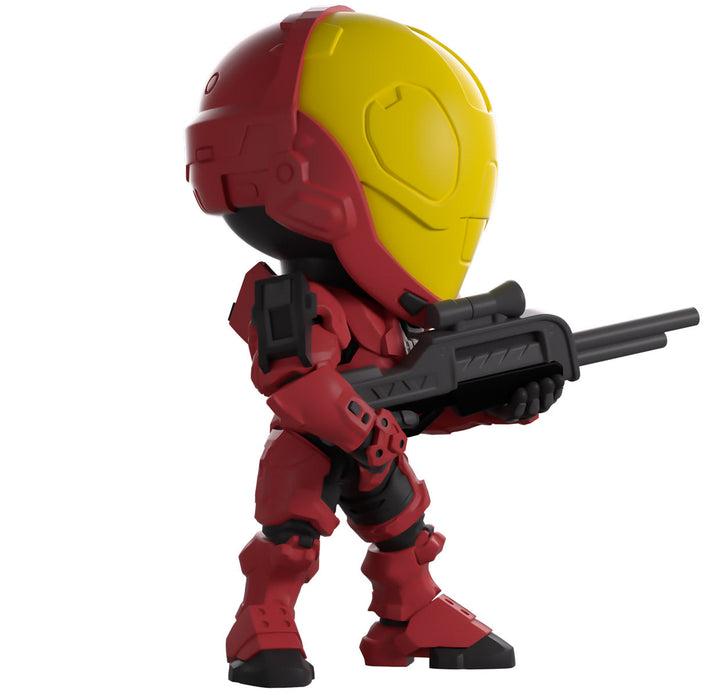This Spartan is armoured up and ready for battle! Standing at 4.6 inches tall and holding a battle rifle gripped in their hands as they get prepared to take down an unsuspecting enemy, the front of their helmet is covered by a bright yellow patterned visor as red EVA armour covers their entire body in thick plates that wrap over their chest, arms and legs. The exterior of his packaging shows an alien monument behind a shallow blue stream, while the light grey interior is covered in angled patterns which extend onto the protective sleeve with the UNSC logo as his figures can be seen through the large clear window at the packaging’s front. This collectible ships in a matte, embossed, protective outer sleeve and a custom-sized plastic protector for maximum protection during shipping.