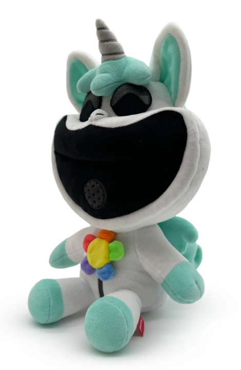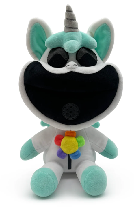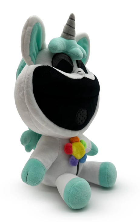 CraftyCorn has arrived at Youtooz to light up the place with a fresh coat of paint! Oh, and their plush debut of course! Sitting at 9 inches tall with their huge open mouth stretching into an unnerving wide smile that reveals a small air tube, dark round eyes adorn their white face underneath a bright blue mane and a pointed horn with long rounded ears on either side. With a multicolored flower on their chest, long arms and legs stretch out from a rounded body, their hands and feet matching their blue mane while a fluffy tail extends from their back. This plush is packed to the seams with 100% PP cotton and is made of the softest minky material, absolutely perfect for cuddling or making some art with!