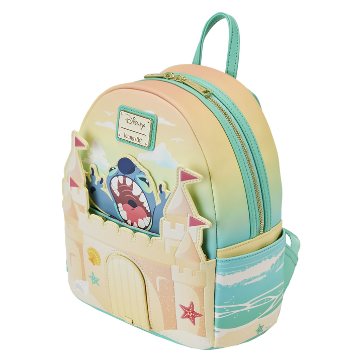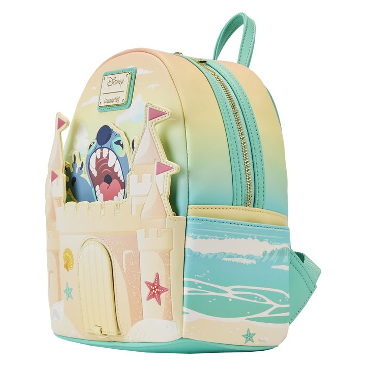 Look out-of-this-world beachy keen with our Loungefly Disney Stitch and Sandcastle Beach Surprise Mini Backpack. On the front, Stitch looks ready to tear into a perfectly sculpted sandcastle, and he moves up and down on a slider! The castle door in the front opens to reveal Scrump. Beach and ocean details continue on the side pockets, and on the back, Stitch makes a colourful encore appearance. He’s wearing sunglasses and sipping on a tropical drink. The sun sets on the horizon as a sailboat passes by. In the shade of a palm tree, Scrump keeps Stitch company. Escape from the everyday and blast off to new adventures.