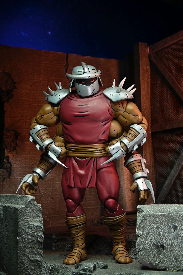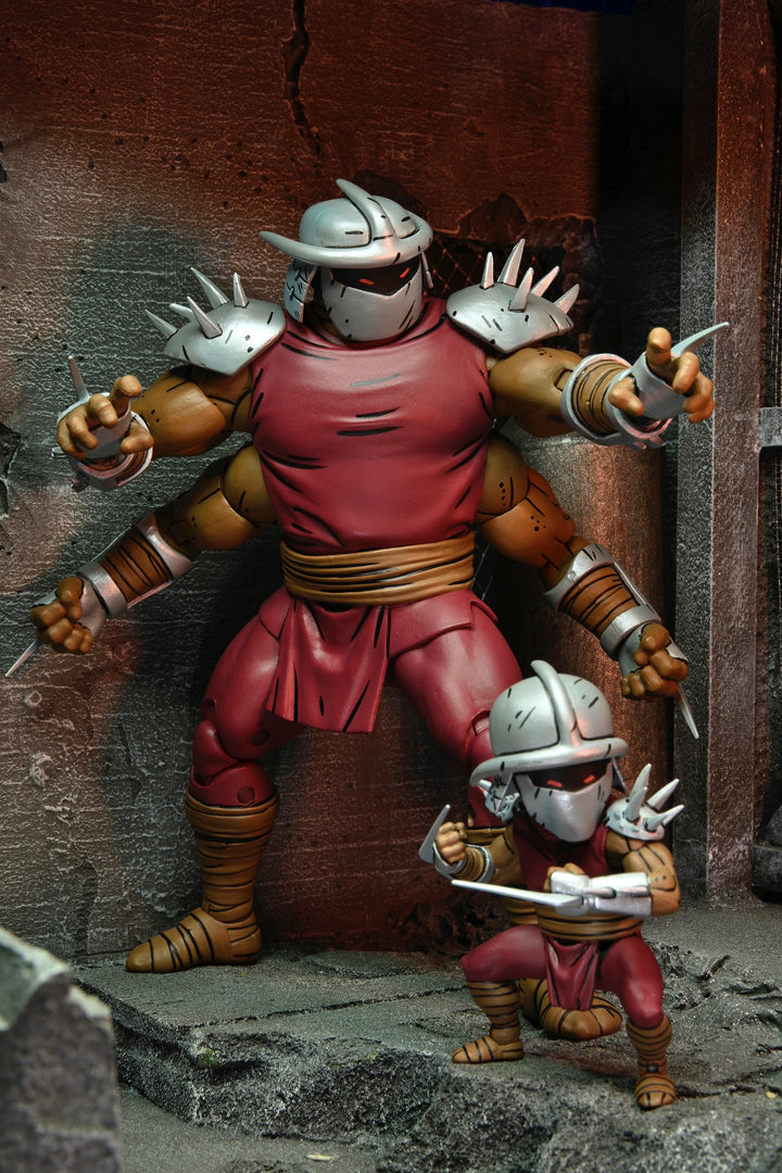 Based on the original Eastman & Laird Teenage Mutant Ninja Turtles comic books from Mirage Studios! Shredder is back... sort of? The Foot have conducted cloning experiments to bring their leader back from the grave. As they work out the bugs, or more specifically, the Space Worms, to perfect the cloning process, the Turtles must battle these twisted monstrosities. These 7" scale figures (4-Arm Shredder is approximately 7" tall and Mini Shredder is 2.8" tall) include extra hands, and space worm attachments to create battle damaged forearm! Comes in special comic-book themed window box packaging with new illustration by Kevin Eastman!
