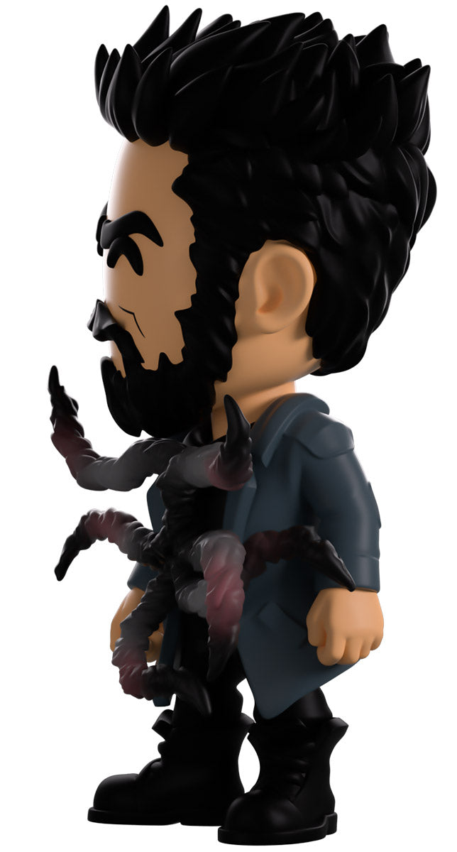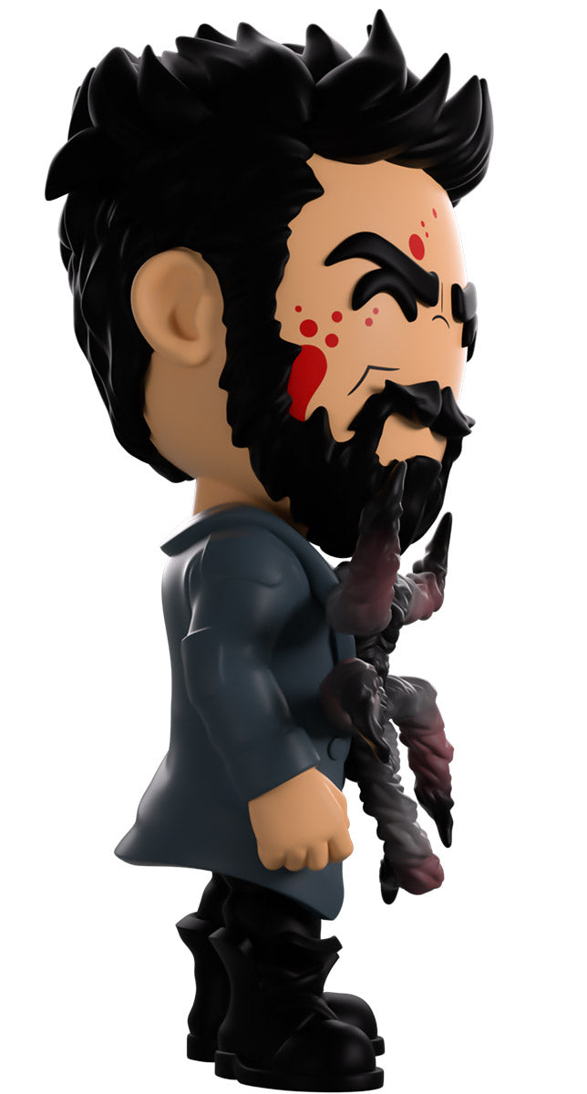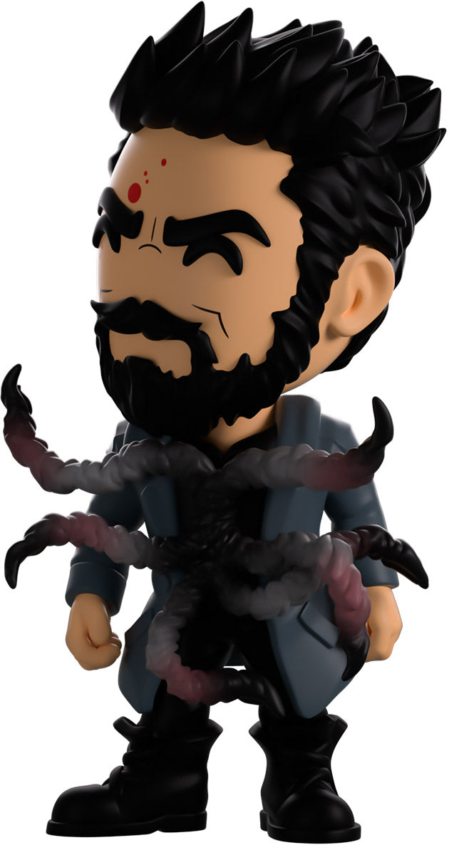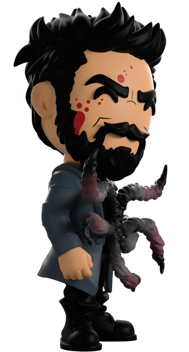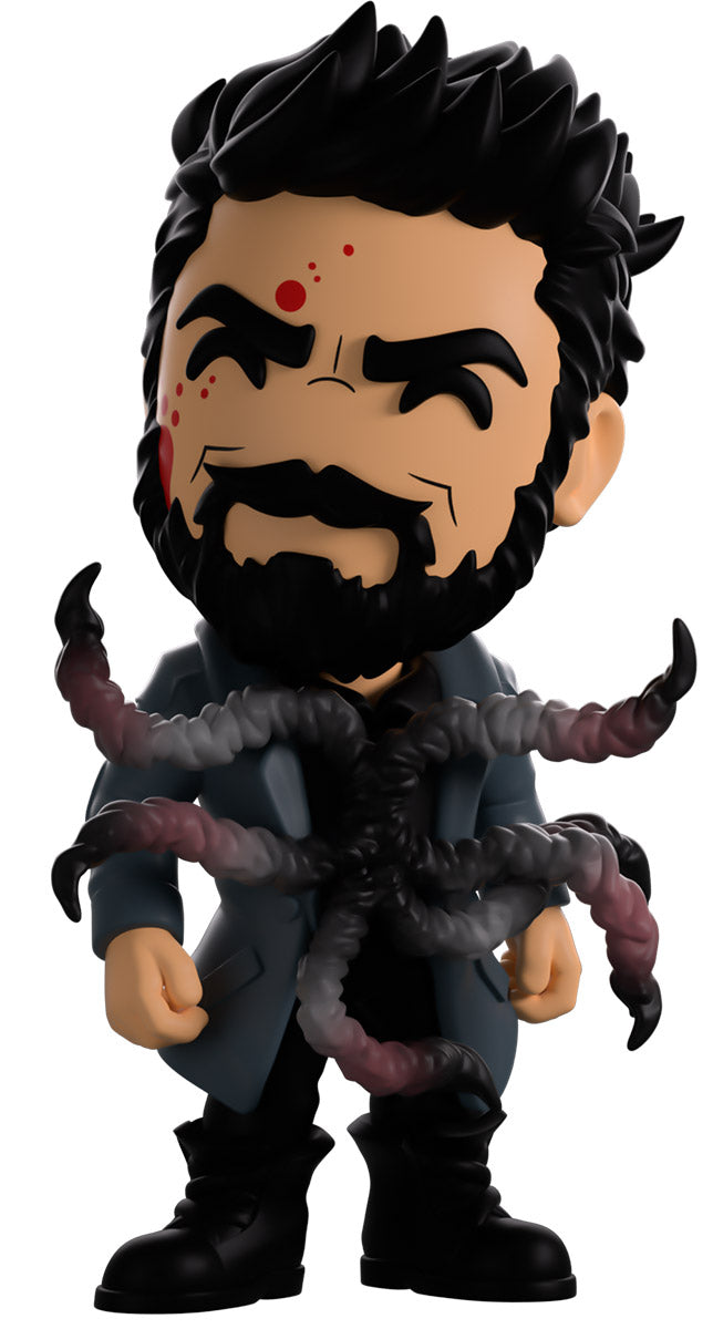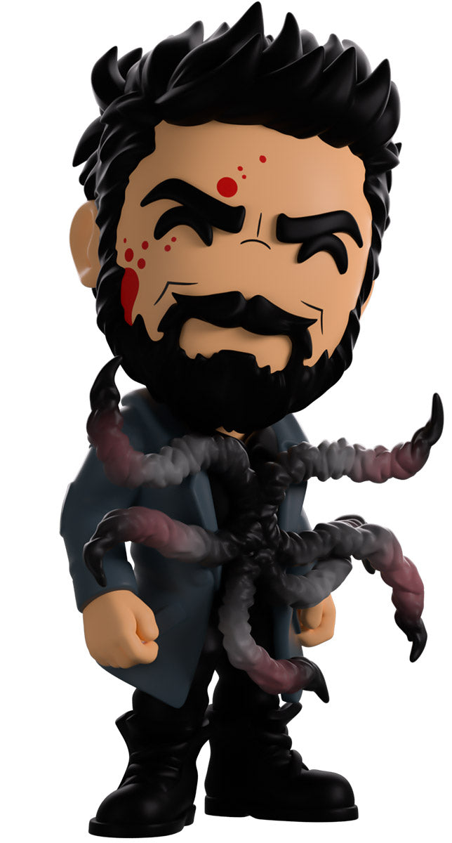 Butcher, you didn’t drink that Temp V did you? Wait, what’s happening to you?! Standing at 4.6 inches tall with blood splattering over the right side of his face, a confident assured smirk hides beneath a thick black beard as his short hair is spiked back. Wearing a long blue trenchcoat with patches on the shoulders and elbows over a black collared shirt, a series of grotesque tentacles writhe and curl out from his torso viciously as his pants are tucked into thick combat boots. The exterior of his packaging sees Butcher in a dark warehouse as long tentacles explode from his chest. The interior then surrounds him in a graffiti scrawled white brick wall that continues onto the protective sleeve with blood stains as his figure can be seen through the large clear window at the packaging’s front. This collectible ships in a matte, embossed, protective outer sleeve and a custom sized plastic protector for maximum protection during shipping.