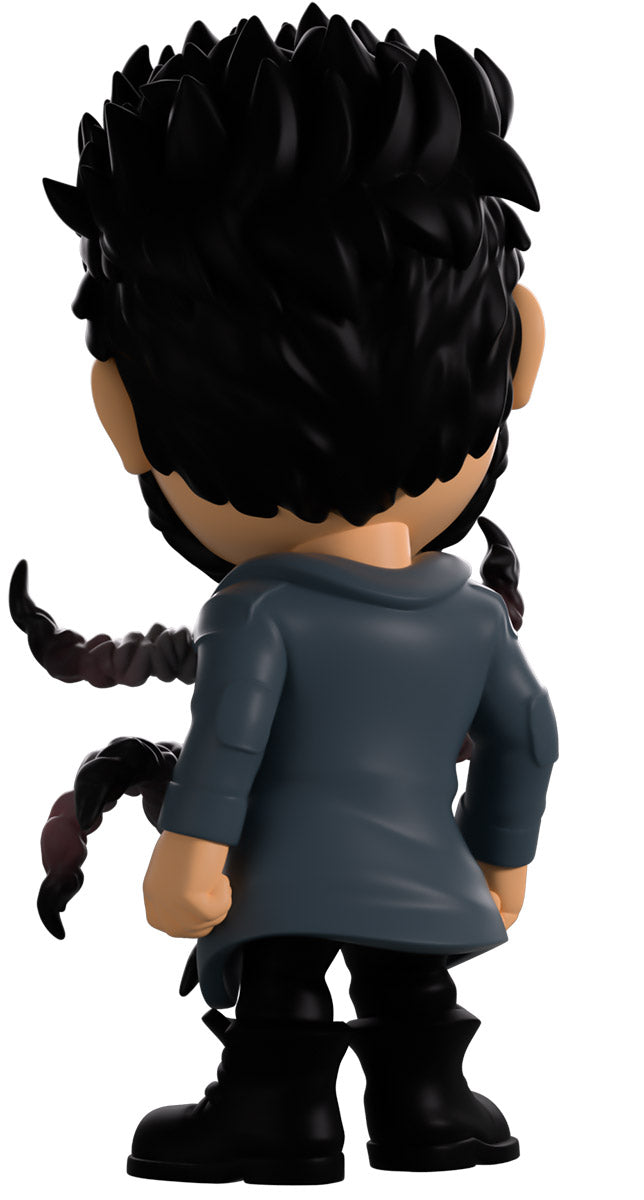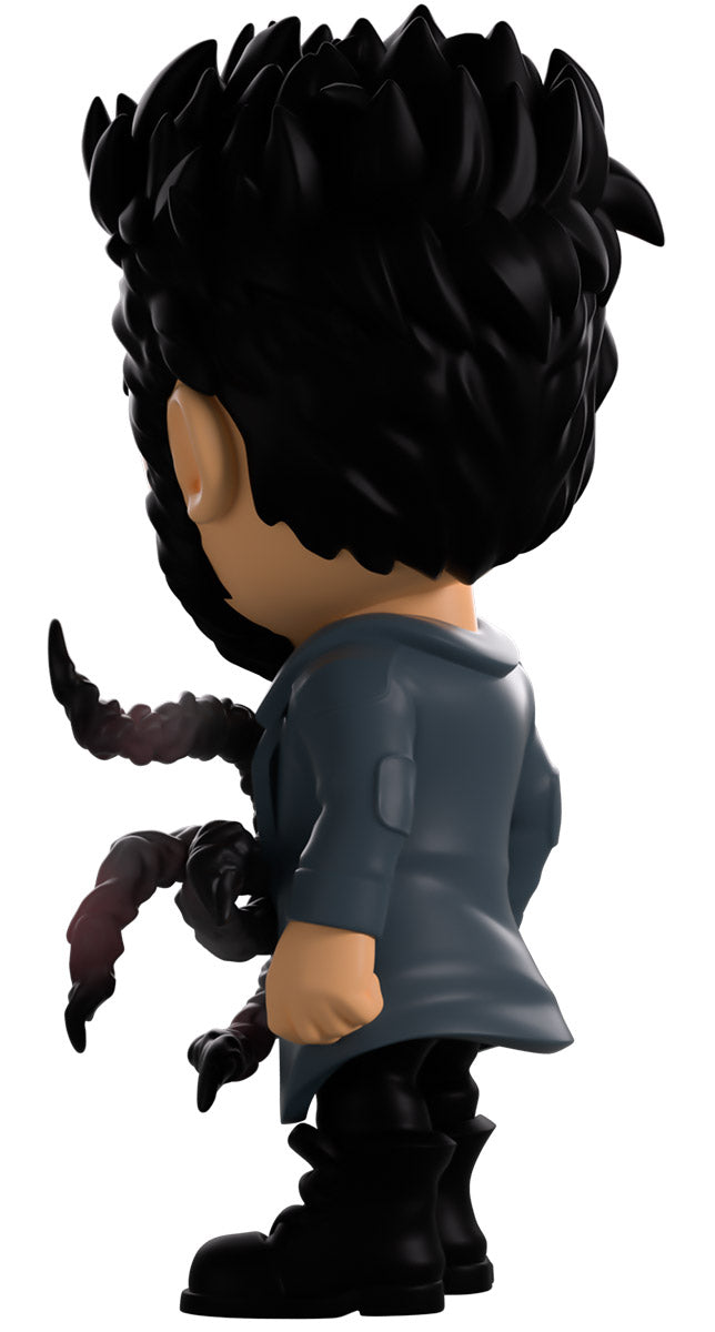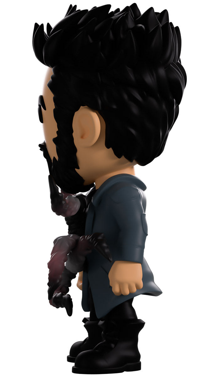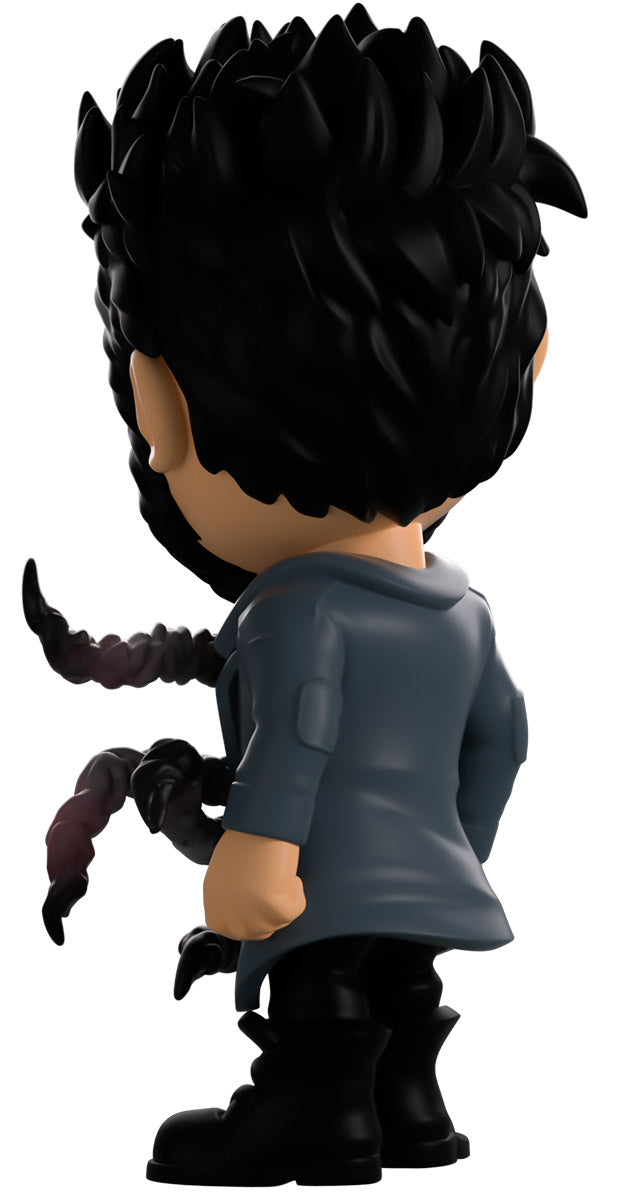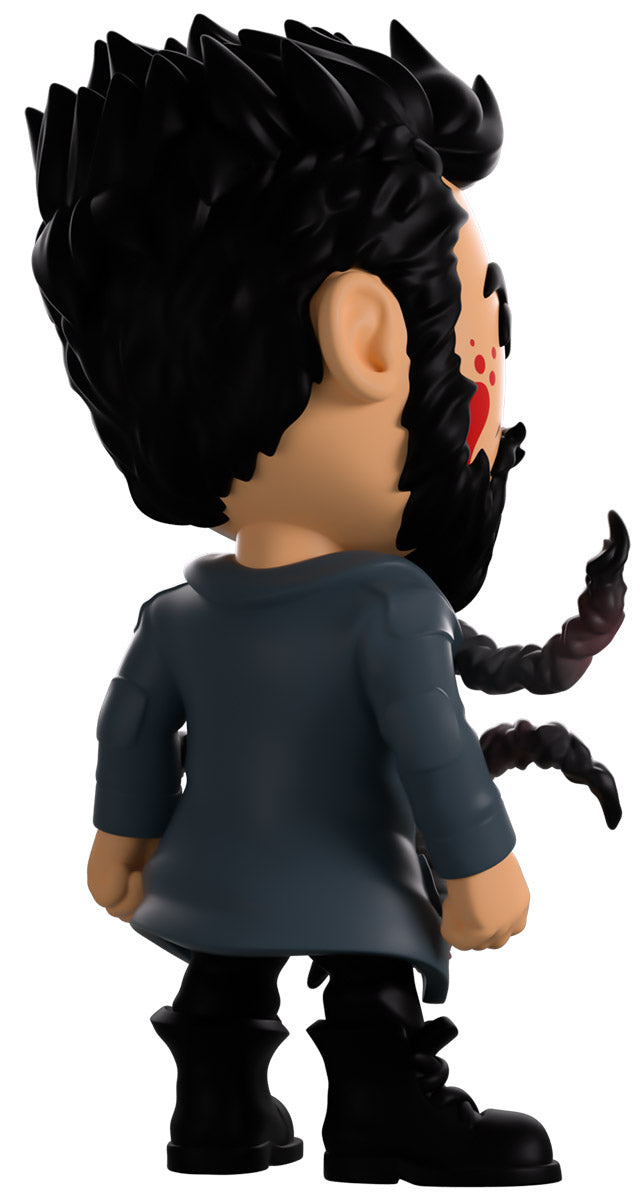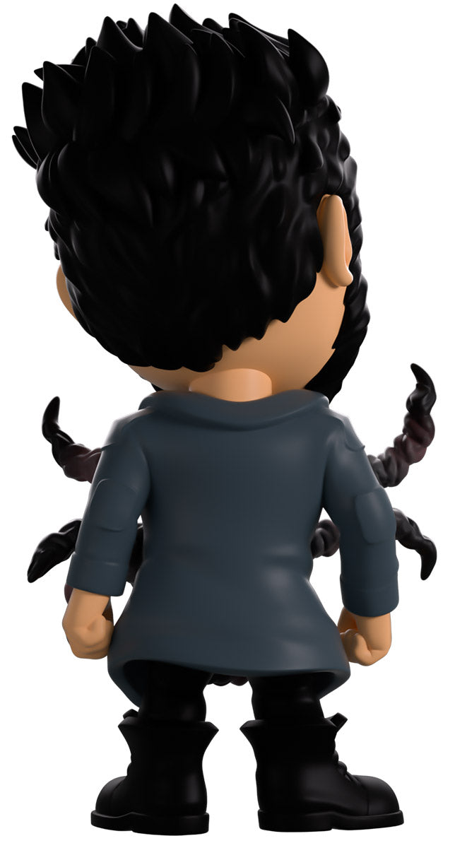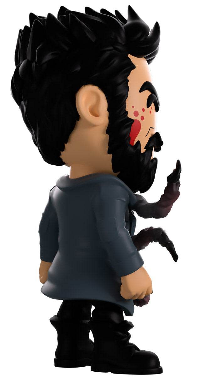 Butcher, you didn’t drink that Temp V did you? Wait, what’s happening to you?! Standing at 4.6 inches tall with blood splattering over the right side of his face, a confident assured smirk hides beneath a thick black beard as his short hair is spiked back. Wearing a long blue trenchcoat with patches on the shoulders and elbows over a black collared shirt, a series of grotesque tentacles writhe and curl out from his torso viciously as his pants are tucked into thick combat boots. The exterior of his packaging sees Butcher in a dark warehouse as long tentacles explode from his chest. The interior then surrounds him in a graffiti scrawled white brick wall that continues onto the protective sleeve with blood stains as his figure can be seen through the large clear window at the packaging’s front. This collectible ships in a matte, embossed, protective outer sleeve and a custom sized plastic protector for maximum protection during shipping.