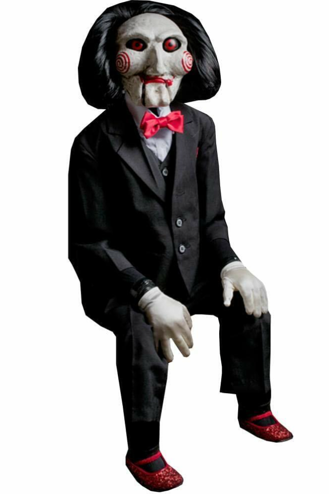 Every detail of the screen used Billy puppet is represented in this prop. Everything is here including Billy's suit, shoes, and gloves. The SAW Billy Prop has a wire frame enclosed in a polyfoam body making him fully posable.