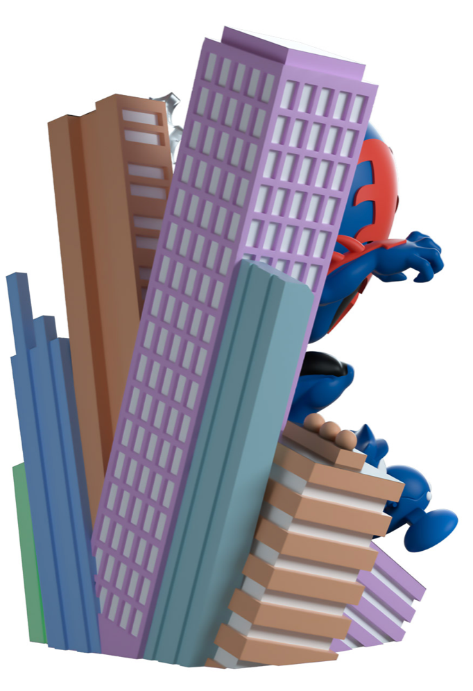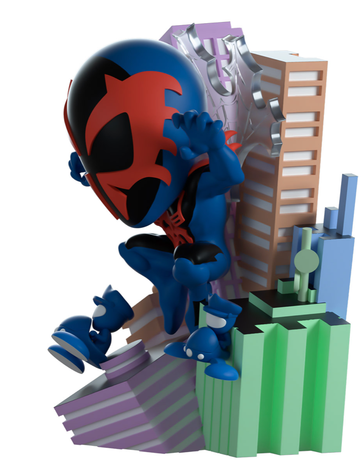 Leaping forward at 5.1 inches tall with his arms and legs raised, Miguel flies through the air as a series of colorful buildings fan out in the background and small blue police whip around his sides. His muscular body is covered in a tight blue suit with black and red markings which stretch their way up to make the sharp spider on his chest, pointed mask and arm spikes. The exterior of the packaging shows Spider-Man making his way through the air of a future city as the police pursue him, while the interior is covered in light grey panels of Marvel comics. The protective sleeve is covered in a red almost computer chip pattern with small images of the city peering through as his figure can be seen through the large clear window at its front. This collectible ships in a matte, embossed, protective outer sleeve and a custom-sized plastic protector for maximum protection during shipping.