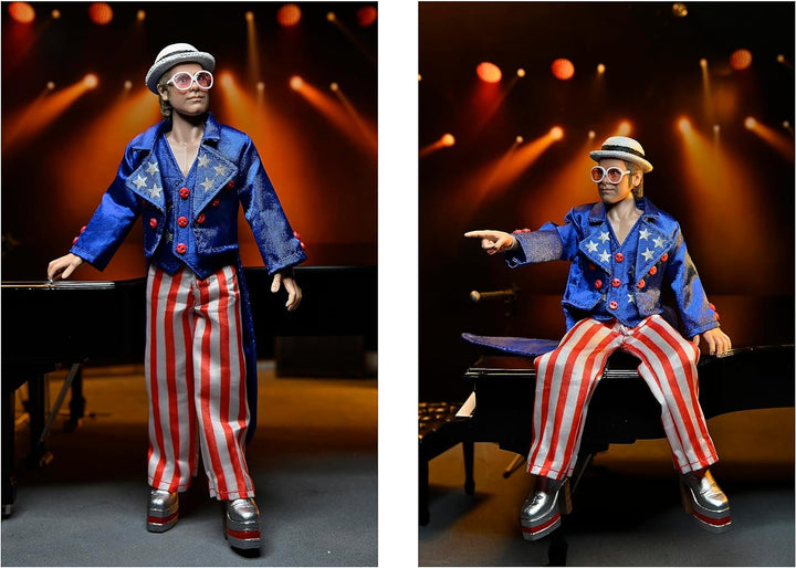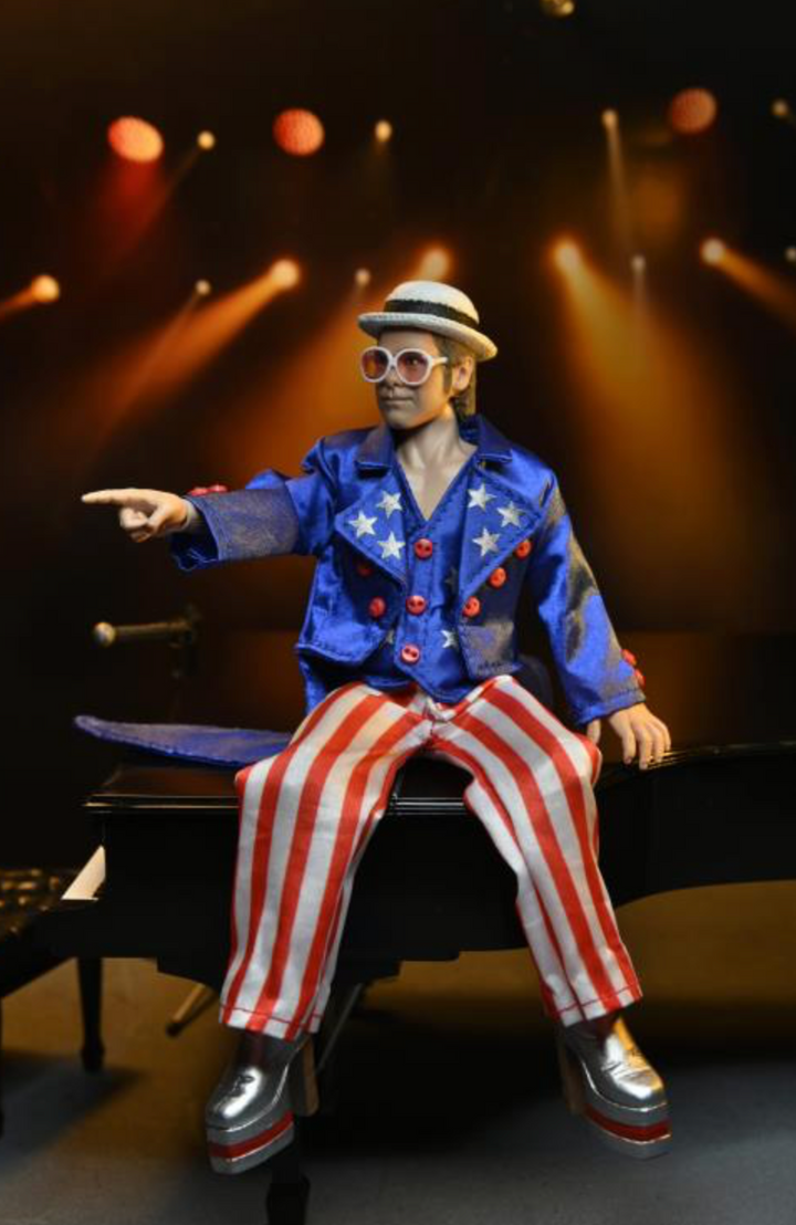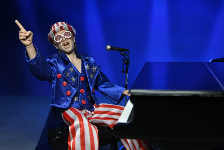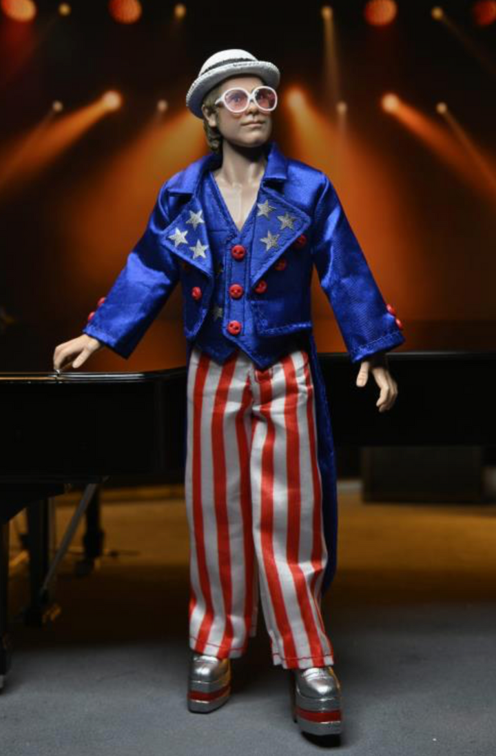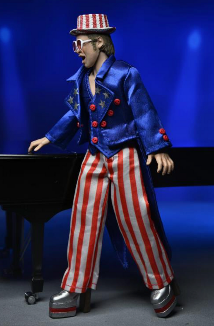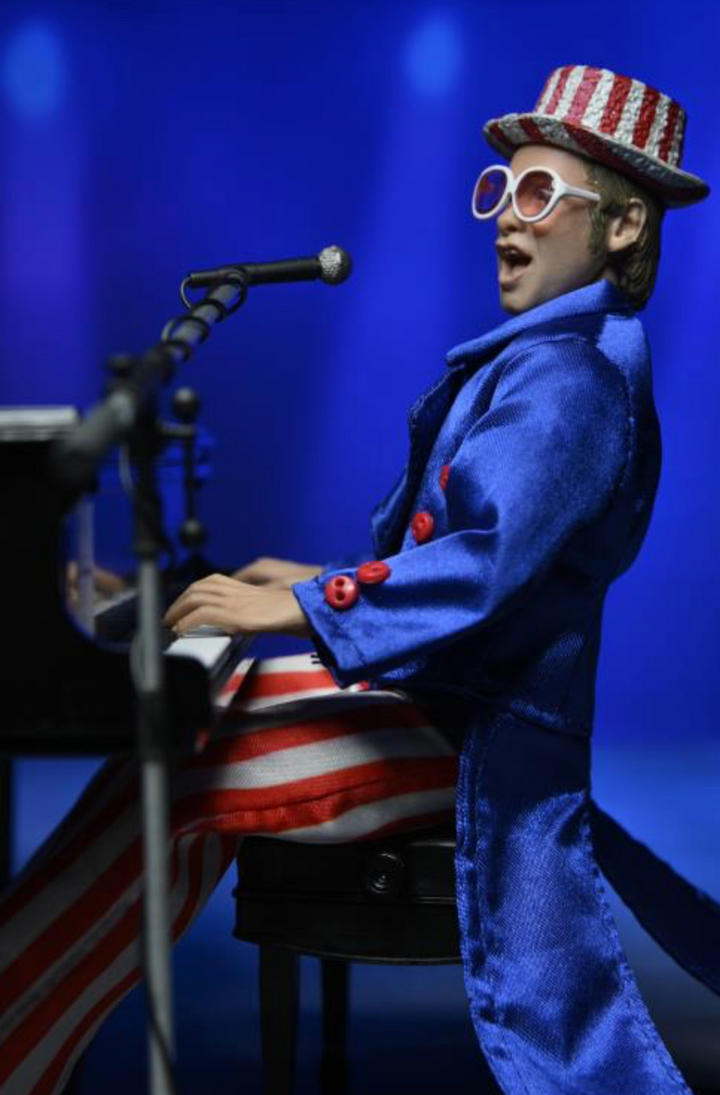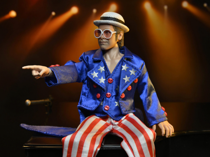 The Elton John Live in '76 action figure set stands 8 inches (20.3 cm) tall and features the legend in his patriotic best: a shimmering coat-tail tuxedo resplendent in red, white, and blue.