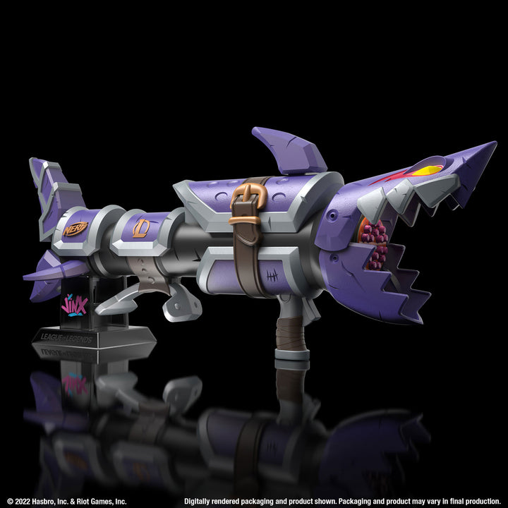 Nerf LMTD is a premium, fan-focused line from the Nerf brand that brings you some of the most iconic items from entertainment and video games. Jinx is one of the most popular characters in League of Legends. This loose cannon lives to wreak havoc with blasters that unleash the loudest blasts and brightest explosions, especially with her beloved rocket launcher dubbed "Fishbones." Jinx gleefully brings her own chaotic brand of pandemonium wherever she goes, and you can do the same with the Nerf LMTD Jinx Fishbones blaster, which is inspired by her blaster in LoL. The 18-dart capacity drum has 6 clusters of 3 darts, so you can blast enemies with a 3-dart burst each time you pull the trigger. Includes 18 Nerf Elite foam darts and a Jinx-style display stand. Everything comes in premium, display-worthy packaging. The mouth manually opens to access the drum. Eyewear recommended (not included). No batteries required.