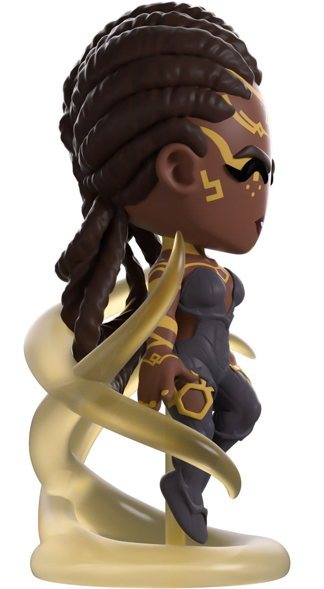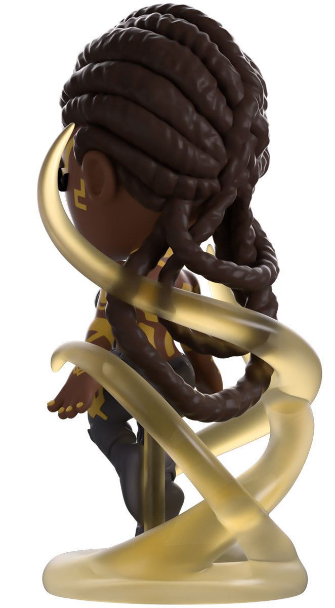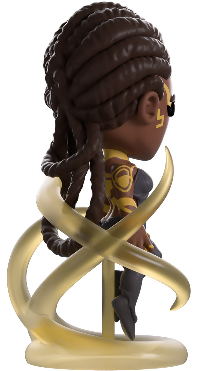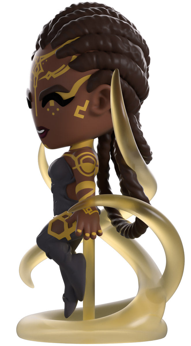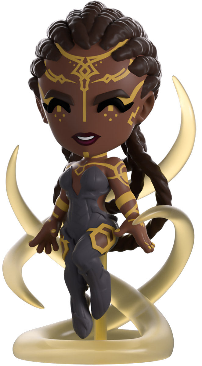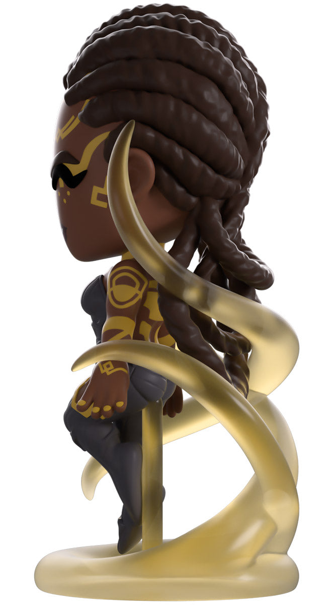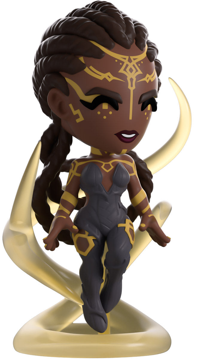 Things have been heating up in the land of Youtooz recently, and we’ve called upon the best political mind we could think of for help! At 4.7 inches tall and levitating amongst swirling clear tendrils as she unleashes her power, intricate golden patterns mark her dark skin and run from her forehead down her arms and back. With her dark braided hair pulled tightly to her head and falling down her back in a trio of thick loops, she wears a dark grey bodysuit that’s covered in weaving stripes and leads down to her feet. The exterior of her smudged yellow packaging has a deep maroon streak running down it which continues onto the interior to surround her completely. The protective sleeve is then a dark blue with a simple golden frame as her figure can be seen through the large clear window at the packaging’s front. This collectible ships in a matte, embossed, protective outer sleeve and a custom-sized plastic protector for maximum protection during shipping.