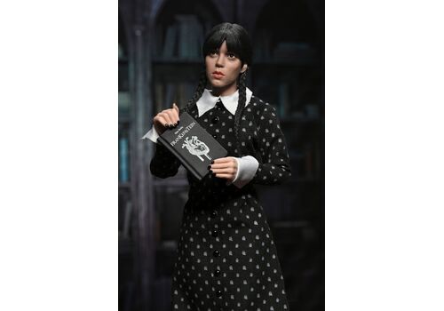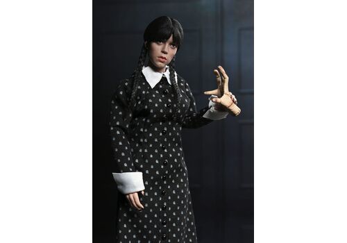 Show off your love for the critically acclaimed Netflix series Wednesday every day of the week with this action figure from NECA! Smart, sarcastic, and a little dead inside, Wednesday Addams finds herself expelled and transferred to Nevermore Academy, a private school for monstrous outcasts. As she adjusts to her strange new environment, she faces murder mysteries, secret societies, local normies, and—worst of all—bright colors. Wearing her classic dress, this fully poseable 8-inch figure features tailored soft goods clothing inspired by vintage toy lines. Accessories include interchangeable hands, Frankenstein book, and her ever-loyal sentient companion: Thing!