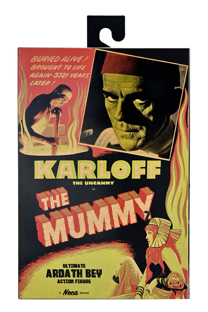 Discover the newest Ultimate Universal Monsters figure from NECA! Featuring Ardath Bey, the Egyptian high priest brought to life by Boris Karloff in the iconic 1932 film The Mummy. This 7-inch action figure captures his haunting quest to resurrect his lost love. It comes with several interchangeable heads and hands, plus detailed accessories like an oil lamp, cane, Scroll of Thoth, and sacrificial dagger.