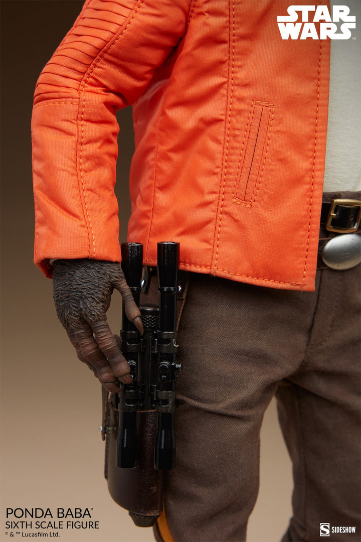 Inspired by the character’s appearance in A New Hope, this fully articulated, highly poseable Star Wars figure wears a cut and sew fabric costume, including brown pants, black boots, a light gray shirt, and a bright orange jacket. The Ponda Baba Sixth Scale Figure comes with a blaster, blaster holster, and three alternate, swap-out hands featuring Ponda’s viciously clawed fingers.