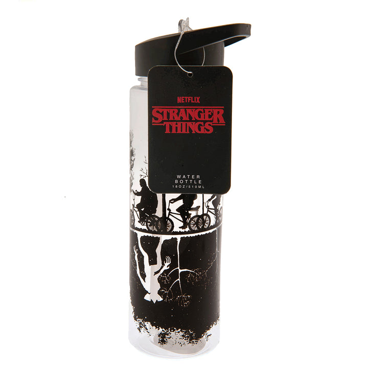 Clear bottle featuring a silhouette group shot and the alternate world The Upside Down
