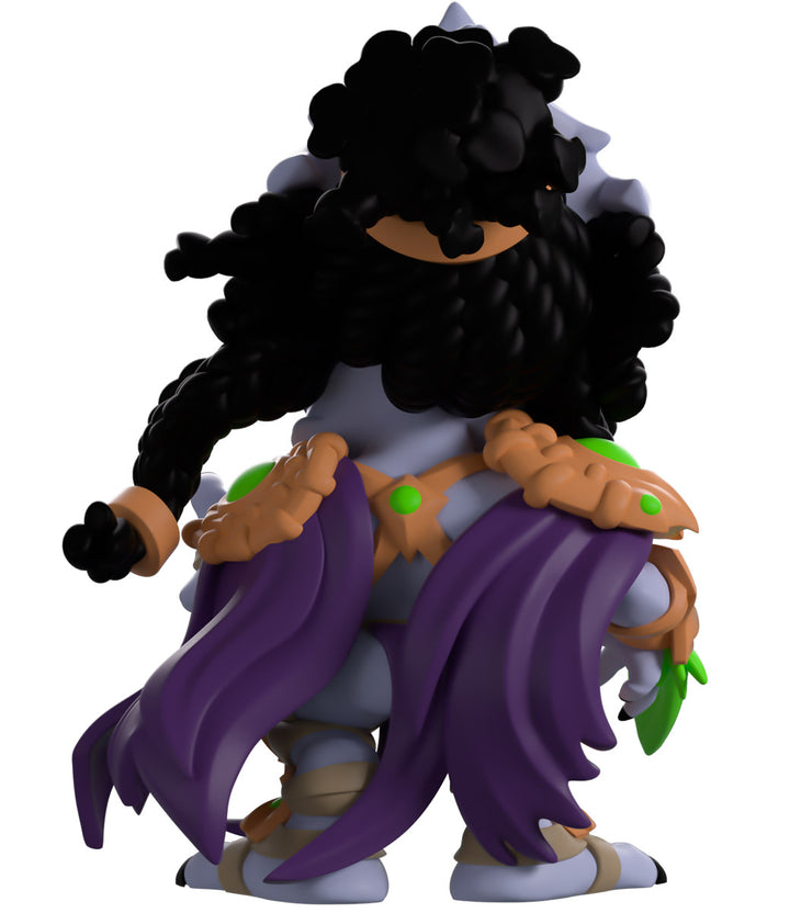 Zeratful has burst through the doors here at Youtooz for his monstrous debut. Standing at 4.5 inches tall as purple robes billow in the wind from different parts of his armour, his left arm reaches forward and his right arm is held back with a green blade attached to it. His iconic brown and green armor decorate his body, as is notable black braided hair is flowing in the wind. The windowed display box has been illustrated to showcase Zeratful standing in a snowy mountain scene. The interior of the box is yellow with a pattern of the Nerazim logo in black. The protective sleeve is a screen of a star-filled night sky. This collectible ships in a matte, embossed, protective outer sleeve and a custom-sized plastic protector for maximum protection during shipping.