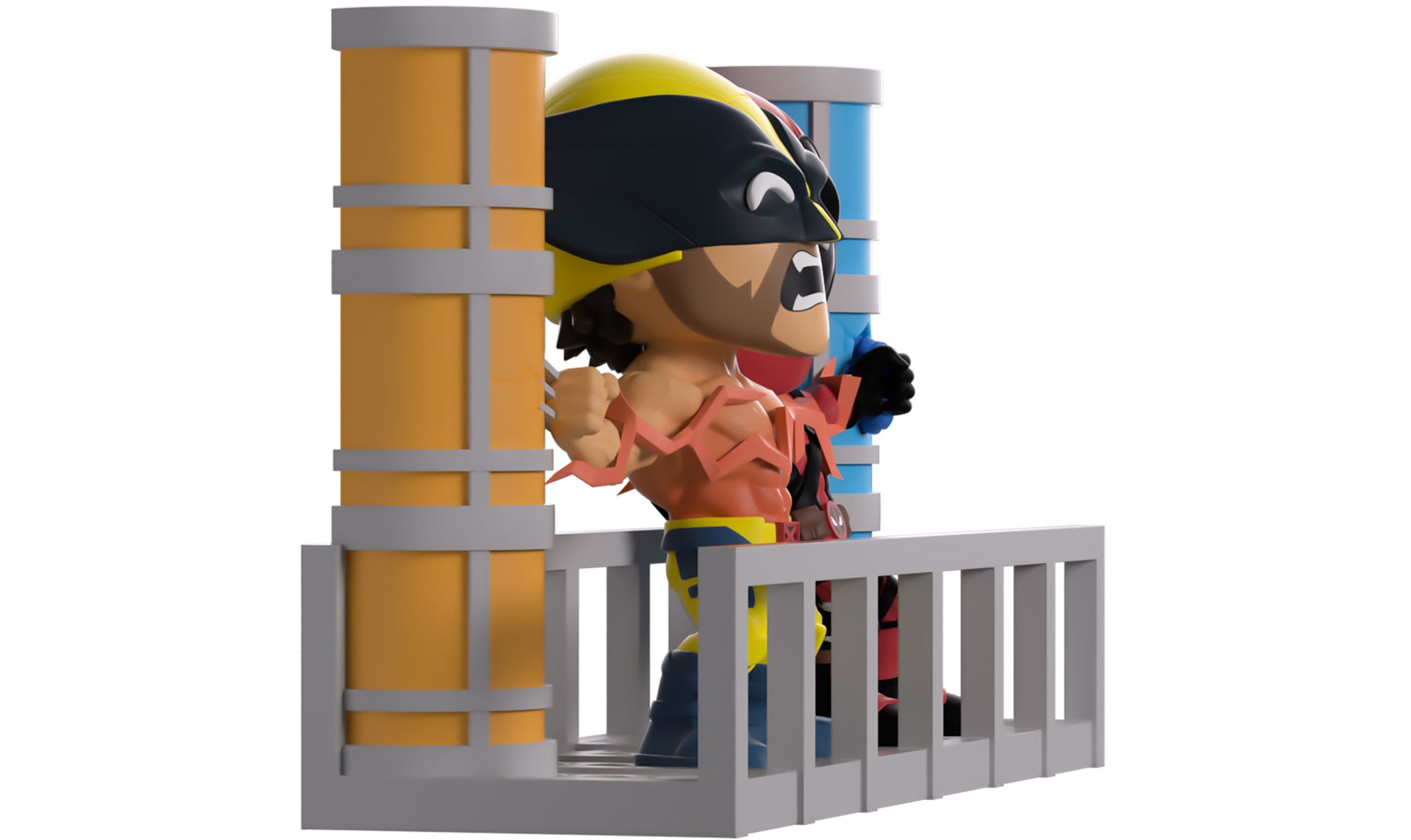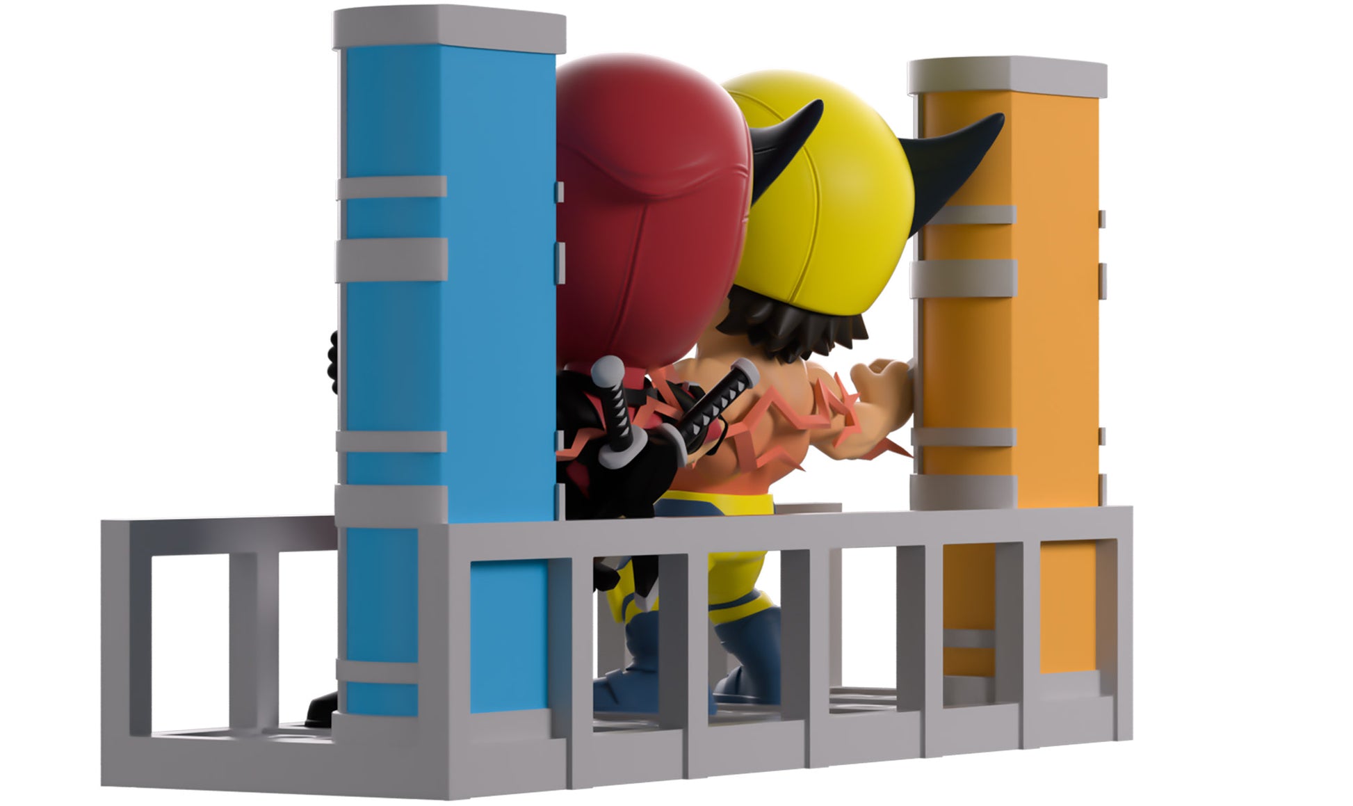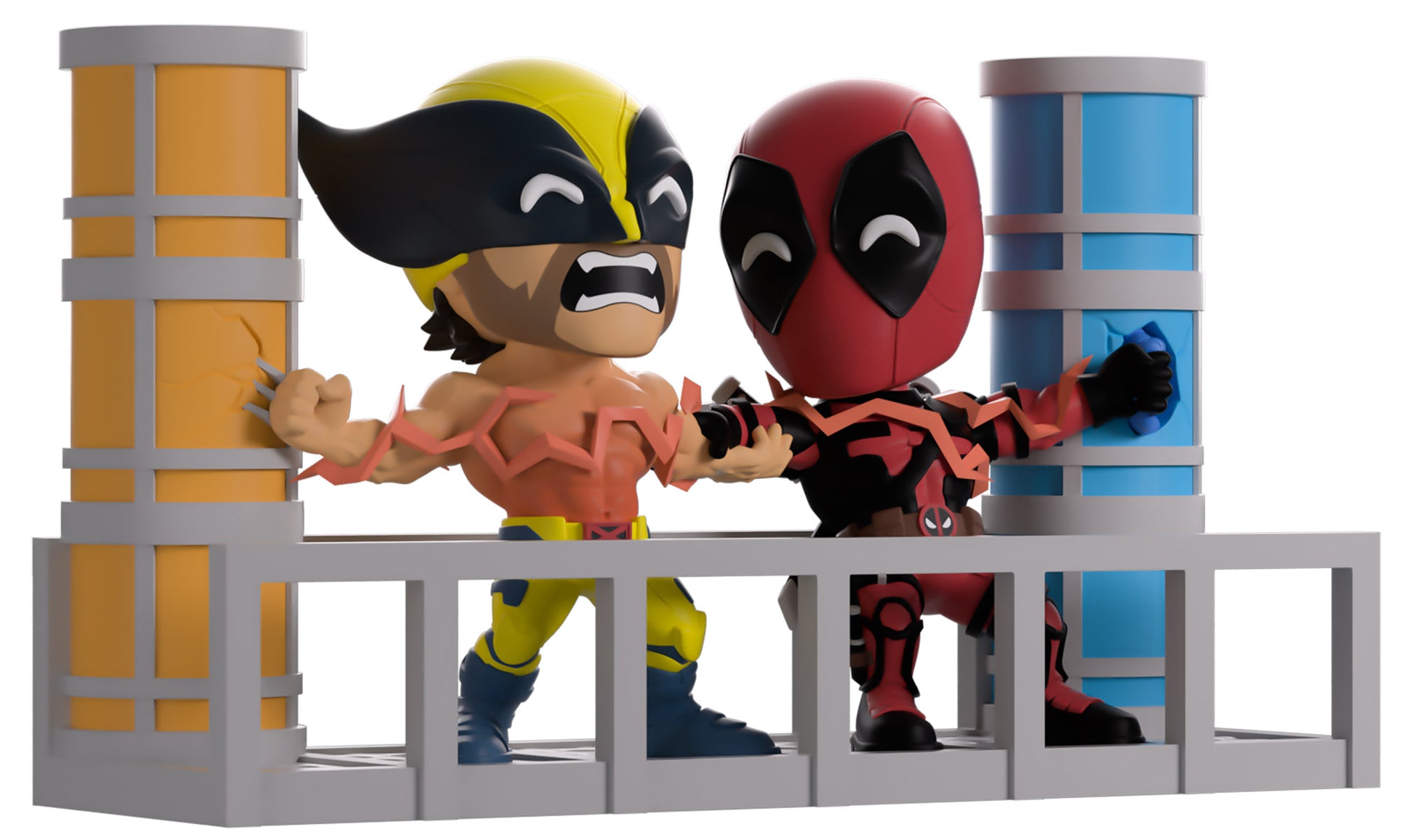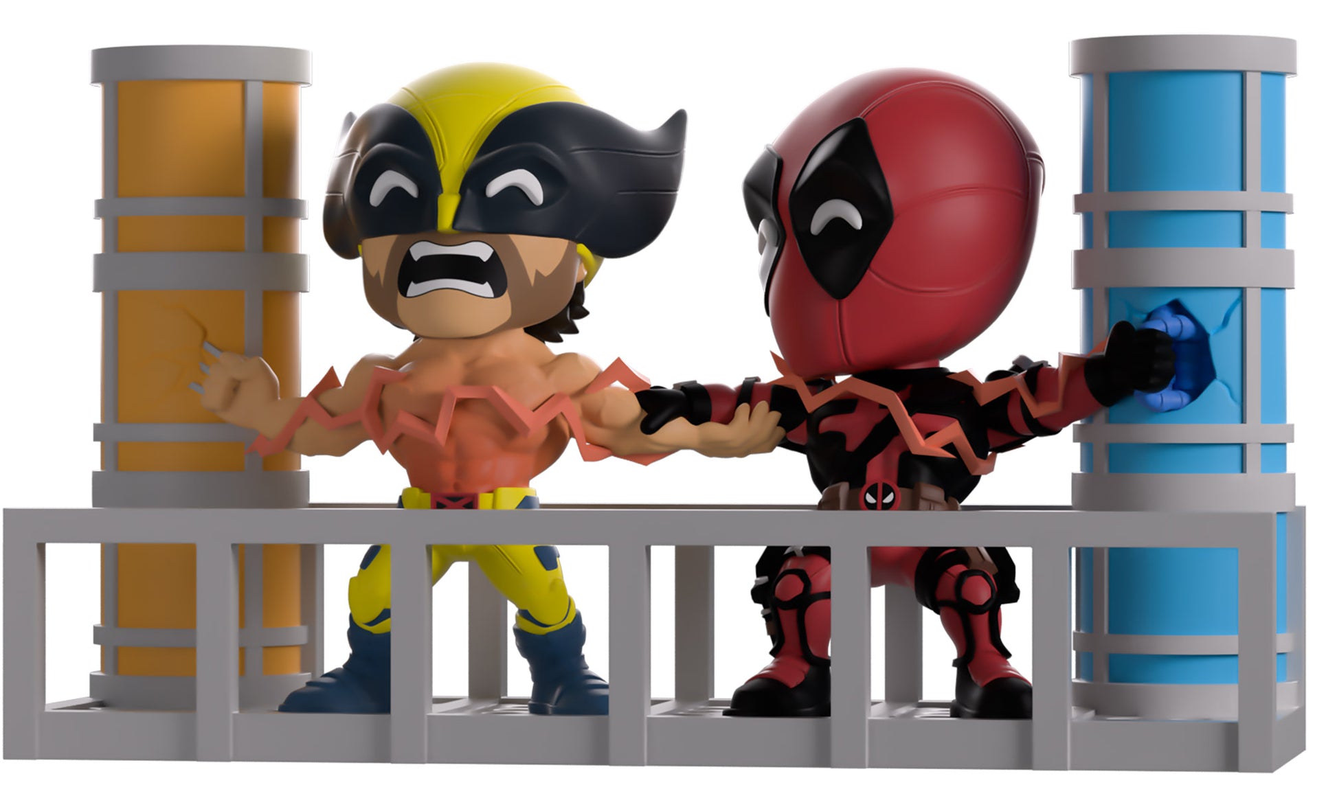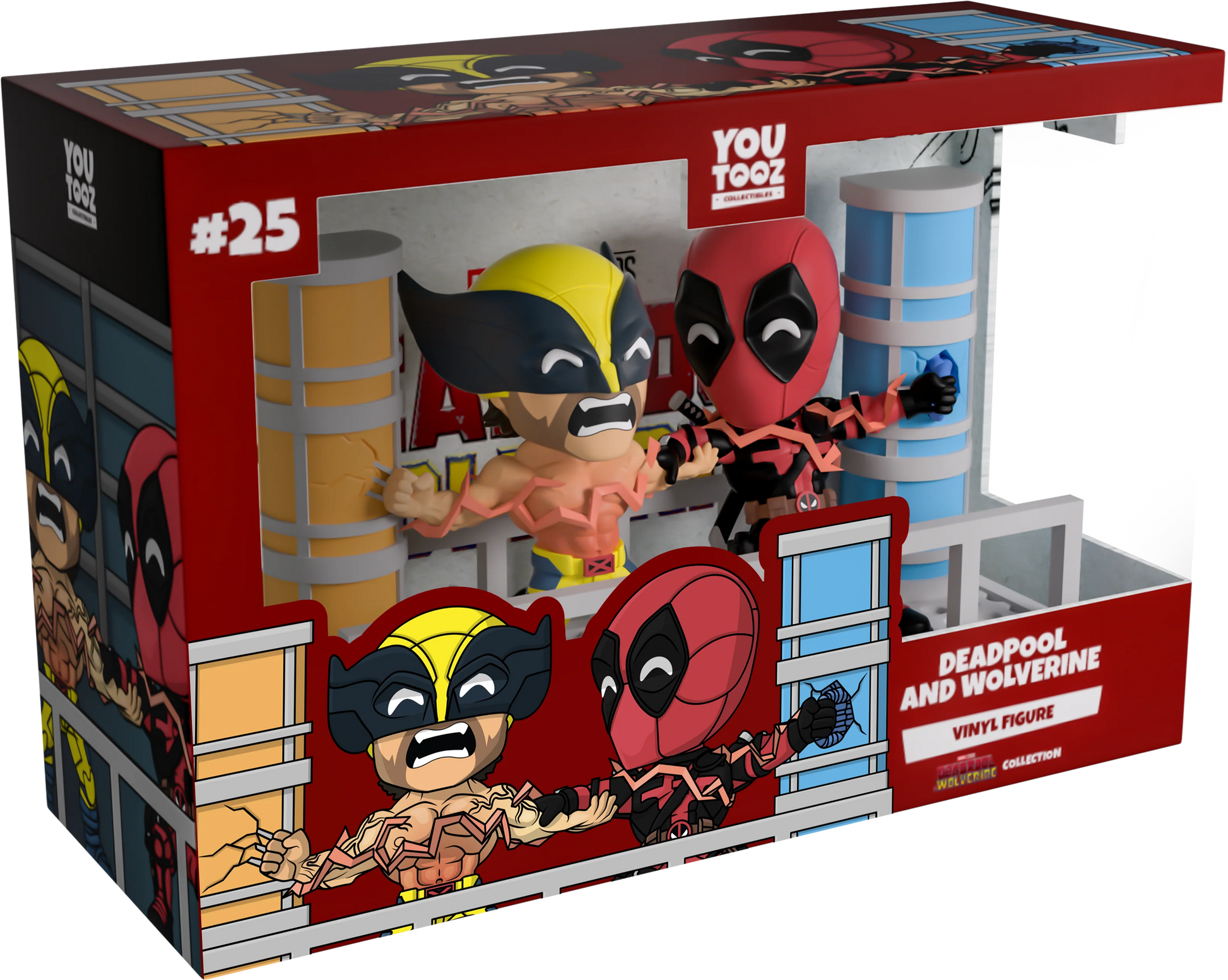 Can you feel the power of our latest Youtooz? Well can you?! Because Deadpool and Wolverine make their return with the most electrifying pair of figures we’ve ever unleashed! At 4.6 inches tall, this powerful scene sees Deadpool and Wolverine grasping each other's arms as they smash their hands (or claws) into the blue and yellow pillars at either side to let a dimension-ending power wrap through their bodies. With Wolverine letting out a pained yell from his mutton-chopped face as his bare chest glows red with electrical heat, Deadpool looks over to say some witty final words which are hidden by his thick red mask. The exterior of their packaging seems the pair between two colored pillars with electricity coursing across their bodies. While the interior mimics rough paper which Deadpool has scrawled over, this then continues onto the protective sleeve where their figures can be seen through the large clear window at the packaging’s front. This collectible ships in a matte, embossed, protective outer sleeve and a custom-sized plastic protector for maximum protection during shipping.