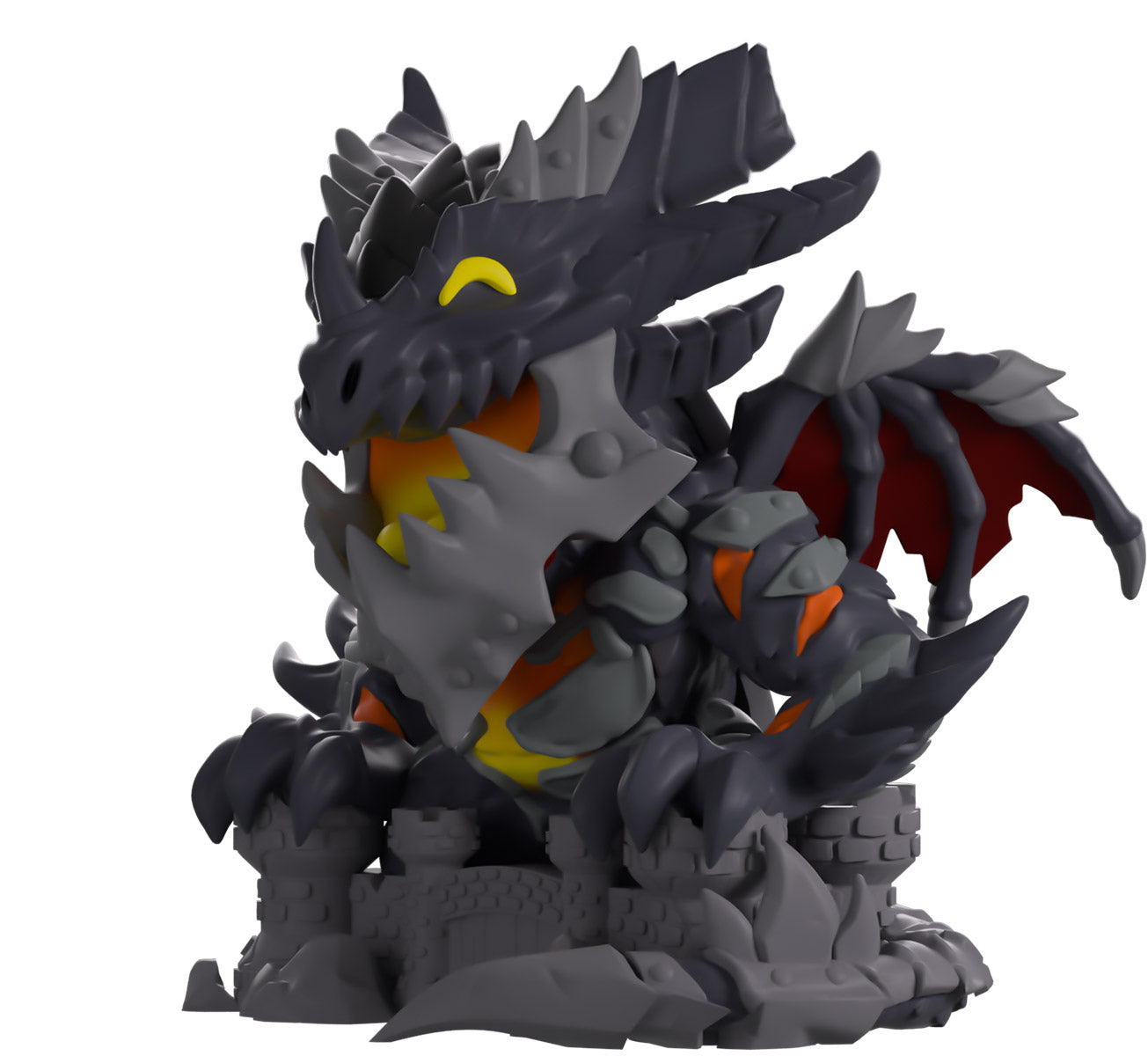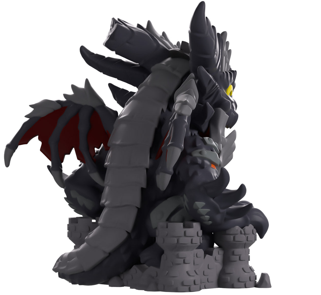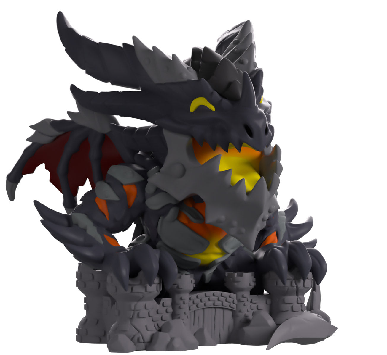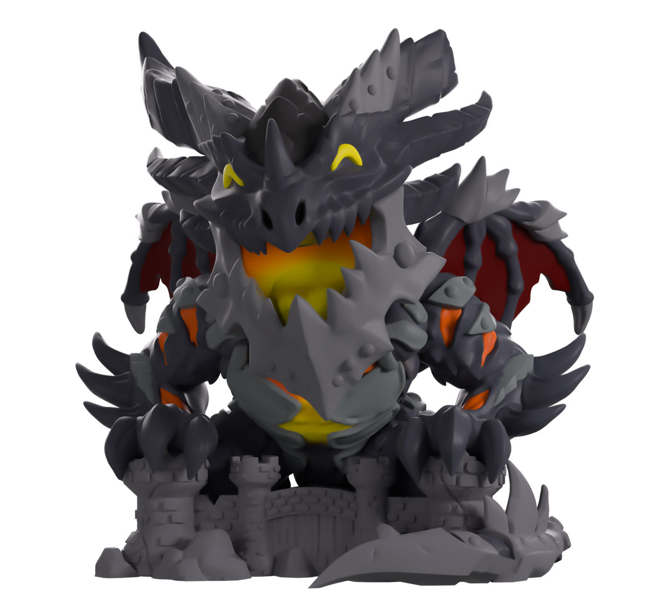 Are you in the mood for a little world-breaking? Because Deathwing has swooped in ready for his next conquest, a Youtooz collectible figure! At 4 inches tall, this figure has been designed to showcase Deathwing looming over castle walls with sharp clawed hands resting upon its round turrets. Shining through his chest between armoured pecs and abs, his yellow and orange skin glows as if the flames inside it are ready to burst outwards while an armoured tail wraps around the sides of the castle walls underneath his wings that spread out to show off a deep red membrane between the bones. With a powerful jaw open in a sinister smile and revealing a yellow and orange mouth, long horns curls barkwards from their head. The exterior of their packaging has been illustrated to show a shadowy silhouette of Deathwing flying over a gorge between calm lands. While the interior and the protective sleeve of the box shows a design of the iconic maps of Azeroth as their figure can be seen through the large clear window at its front. This collectible ships in a matte, embossed, protective outer sleeve and a custom-sized plastic protector for maximum protection during shipping.