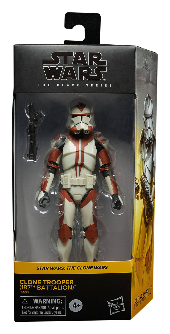The 6-inch-scale Black Series figure is detailed to look like the Clone Trooper (187th Battalion) character from Star Wars: The Clone Wars, featuring premium detail and multiple points of articulation.