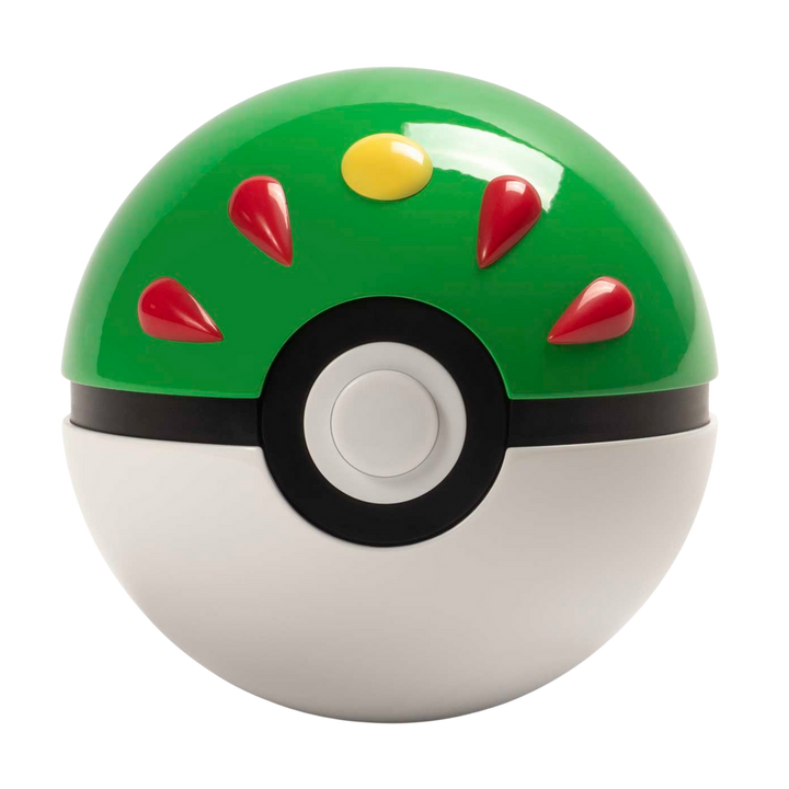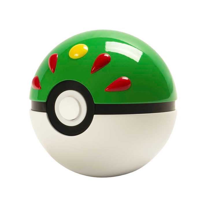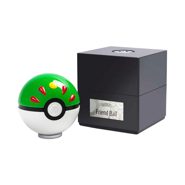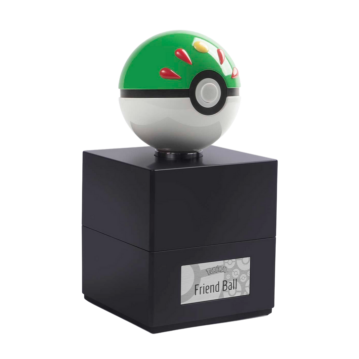 First introduced in the Pokémon Gold and Pokémon Silver video games, the Friend Ball's top half is green with red highlights and a yellow dot at the top; it's one of many Poké Balls made by Kurt using Apricorns! Pokémon caught in this Ball become friendlier toward their Trainers. Now this useful item can be yours with this premium-quality replica from The Wand Company.
