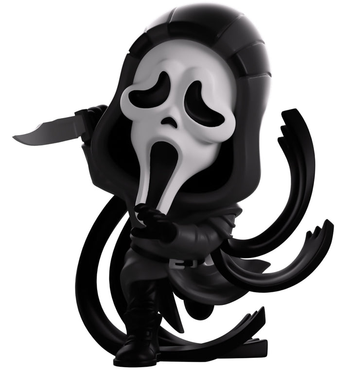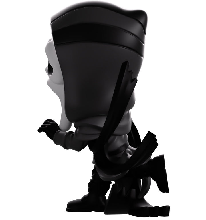 "Do you like scary games?". Ghost Face has tracked down Youtooz, ready and waiting for his next kill! Sprinting forward at 4.6 inches tall with tendrils of his black cloak flying around him as he raised a knife ready for a final kill, his white Ghost Face mask is framed within the black hood of his cloak to truly emobdy fear. The windowed display box has been illustrated to show Ghost Face peeking around the side of a crumbling brick wall in front of tall grass. While the interior is a black silhouetted forest with a glowing red and blue haze and the white ‘Dead by Daylight’ logo at its back, this grim motif then continues onto the protective sleeve with dark trees surrounding it completely as their figure can be seen through the large clear window at its front. This collectible ships in a matte, embossed, protective outer sleeve and a custom sized plastic protector for maximum protection during shipping.