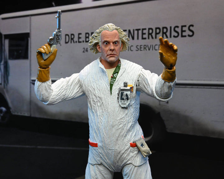 Featuring the official licensed likeness of actor Christopher Lloyd, this Ultimate Doc Brown 7" scale action figure is based on his hazmat suit appearance in 1985.