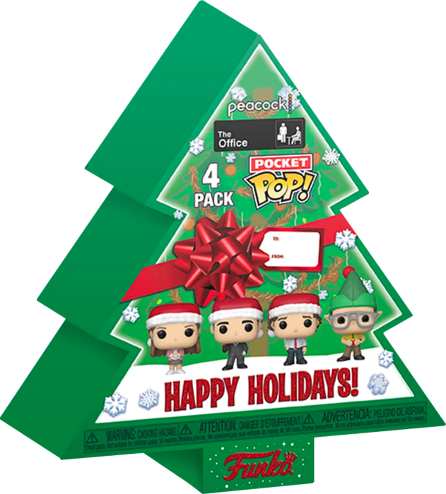Throw a holiday bash the Dunder Mifflin Party Planning Committee will never forget with this US Exclusive The Office Holiday 4-Pack. The Christmas tree-shaped box holds 4 Pocket Pops! of memorable characters, including Pam Peesly, Michael Scott, Jim Halpert, and Dwight Schrute. Hang the mistletoe, grab a Santa suit or two, and pour yourself a cup of good cheer. Make your days merry and bright re-creating your favorite scenes from The Office. Vinyl figures are approximately 1.6-2.19-inches tall.