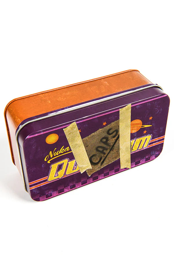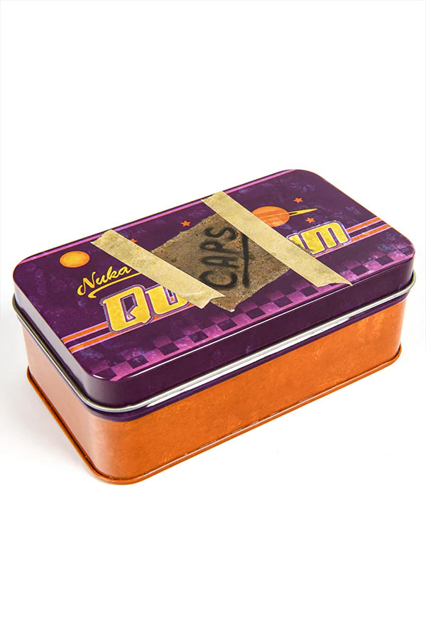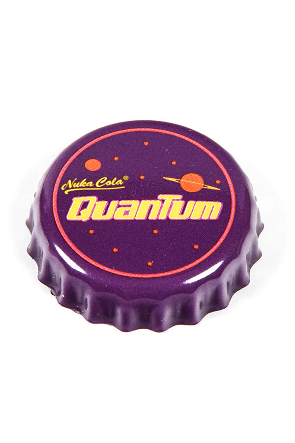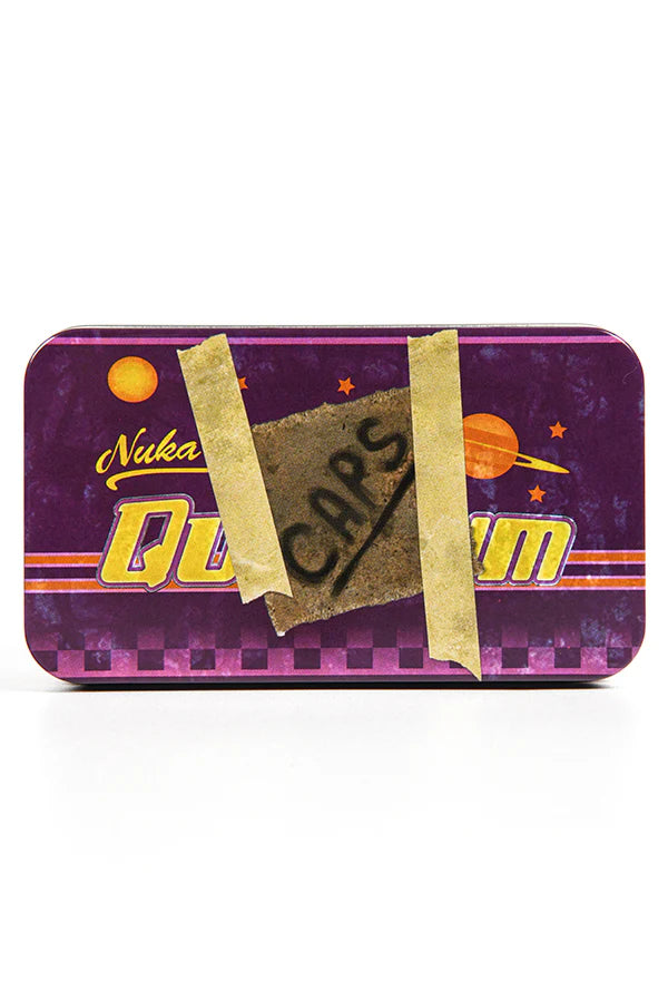 Introducing the Fallout Bottle Cap Series: Nuka Quantum with Collectible Tin. It includes 20 bottle caps featuring Nuka-Cola Quantum branding: logo, planets, and all. This same design is present in the tin the caps come in, albeit boasting a little distress from being out and about in the Wasteland.