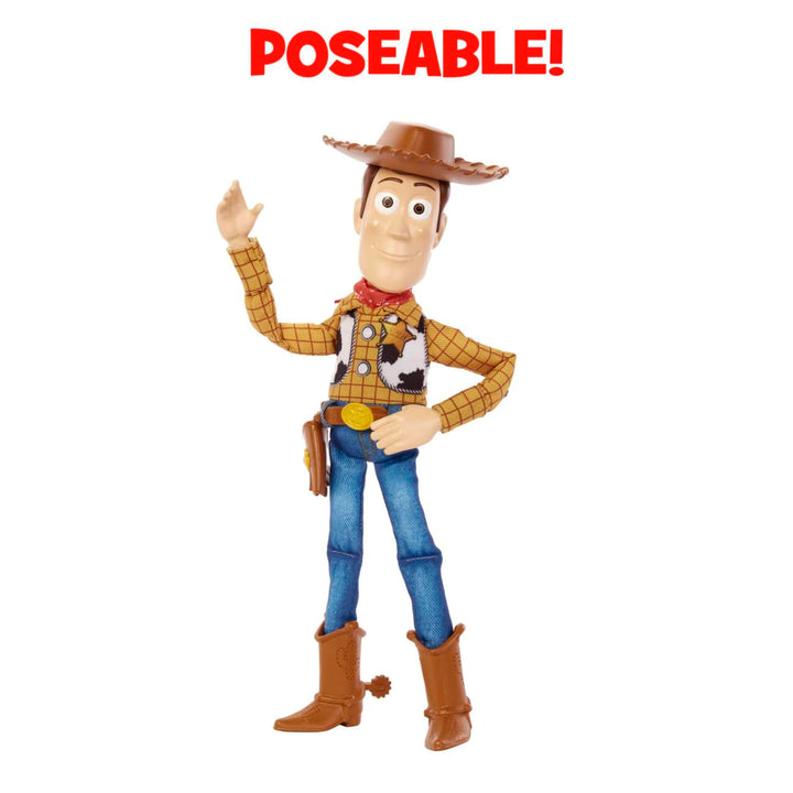 Yes sir, time to round us up an adventure! This Roundup Fun Woody 12 inch figure will bring big realistic thrills to fans of the friendly sheriff from Disney and Pixar's Toy Story movies. With 30+ phrases activated by the pull-tab on his back, fans young and old can discover huge interactive fun. A sheriff always needs his deputy! His truly movie-authentic look is achieved with multiple materials to really bring the character to life, including a soft rag doll body, iconic western shirt, jeans and vest, produced in fabric, and head, hat, boots, belt and hands made of plastic. Kids can relive all their favorite Woody scenes from the movie series, with the phrases coming directly from this talking Woody figure. Like Andy, they'll want to take him everywhere! Colors, dimensions and decorations may vary.