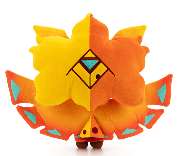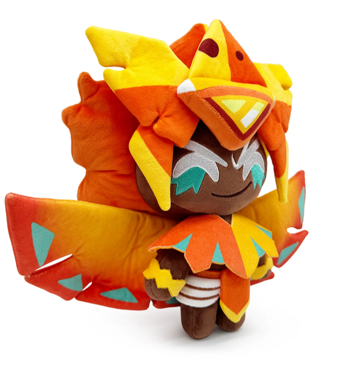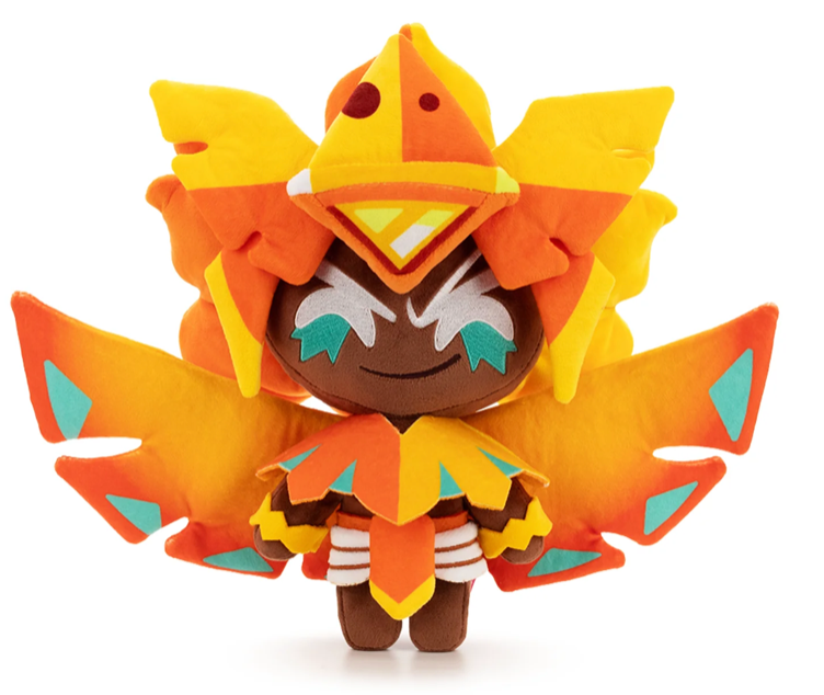 Golden Cheese Cookie has flown down from her gilded palace to grace Youtooz with her plush debut! Standing at 9 inches tall with a confident smile crossing her green-marked brown face under golden glowing eyes, she wears a pointed headdress over the brilliant orange and yellow hair that falls from her head. With long orange wings that are tipped with green arrows stretching out from her back, a pointed top hangs from her neck as she’s dressed in a striped skirt and yellow wristbands. This plush is packed to the seams with 100% PP cotton and is made of the softest minky material, absolutely perfect for cuddling or searching for treasure with!