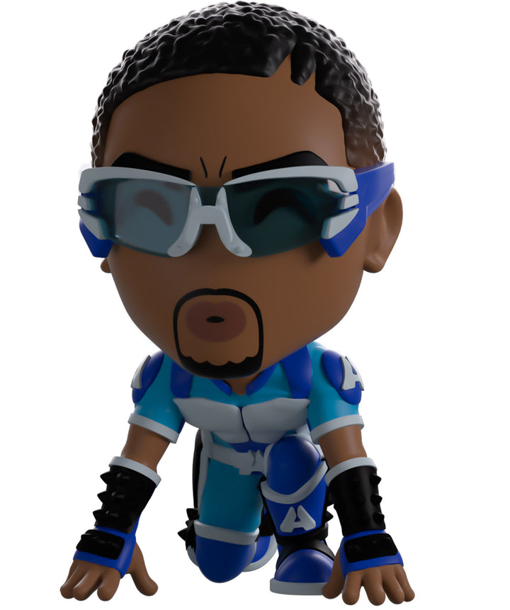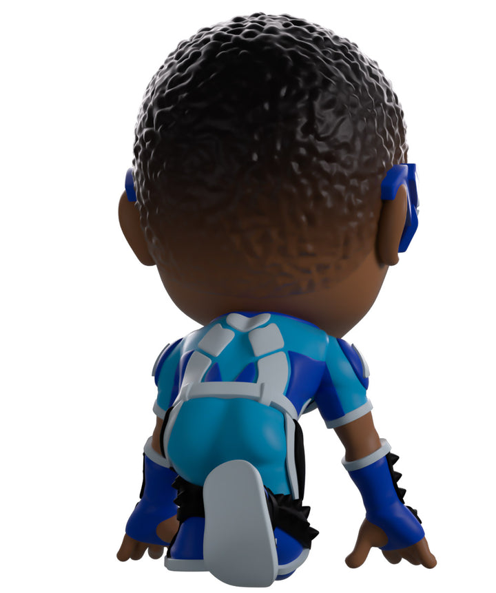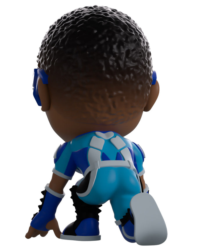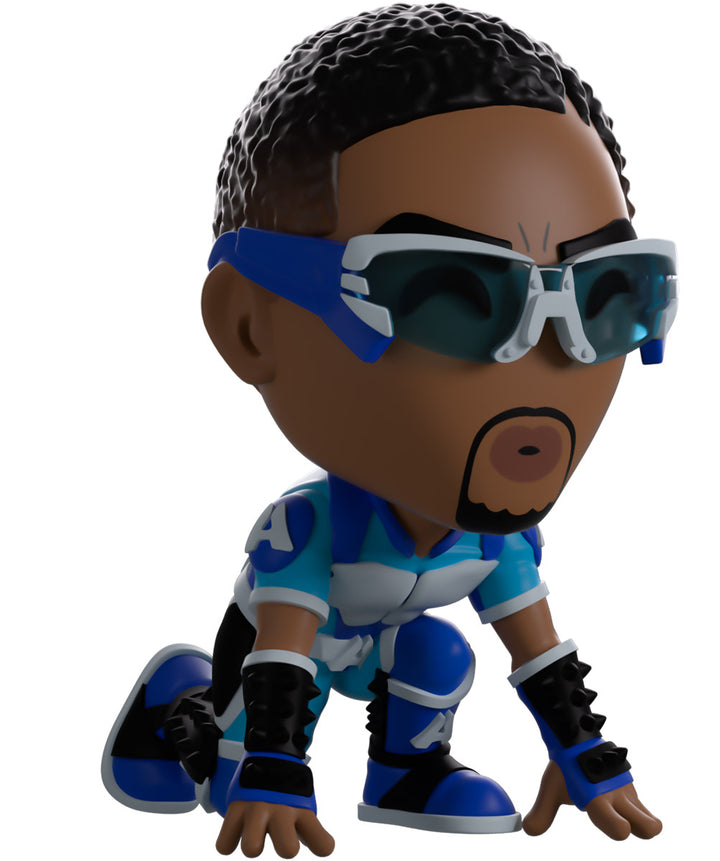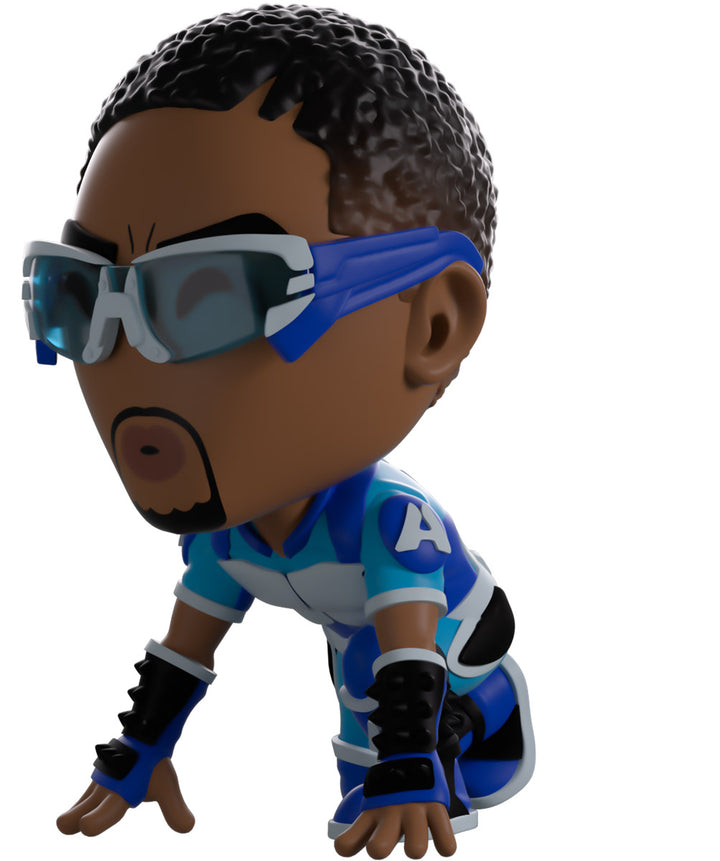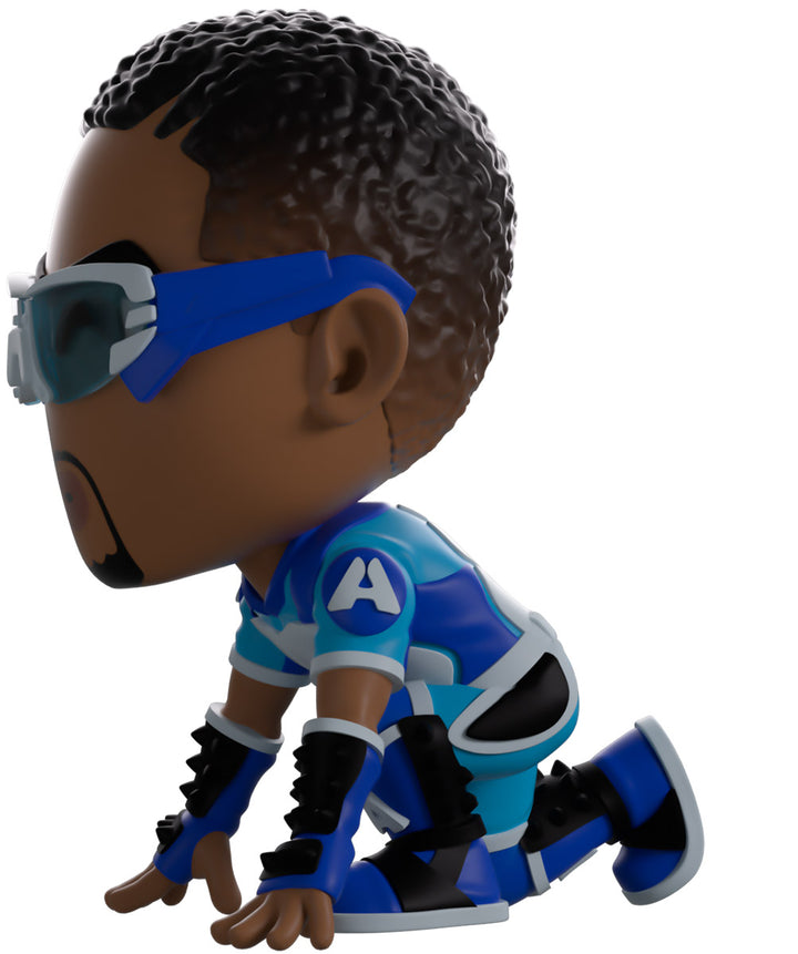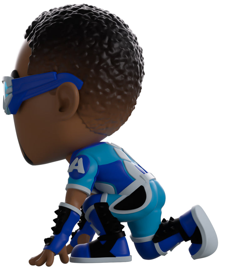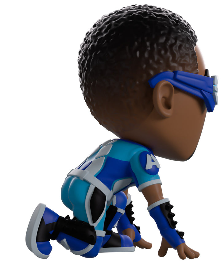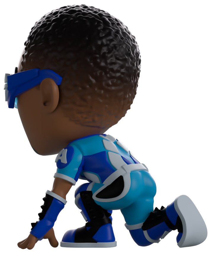 A-Train sped through Youtooz so quickly we couldn't even see him! The trace he was even here is his vinyl debut! Crouched at 3.5 inches tall with his fingers pressed to the ground at his front and preparing to launch into max speed, his lips purse in concentration from within a thin goatee as his short hair fades at the back. Wearing a pair of blue lensed goggles over his eyes, he’s dressed in a tight multi-toned blue suit with grey detailing as a series of spiked black guards protect his arms and legs. The exterior of his packaging sees A-Train ready to sprint off as a bead of sweat drips down his head. The interior surrounds him in a graffiti scrawled white brick wall that continues onto the protective sleeve with blood stains, as his figure can be seen through the large clear window at the packaging’s front. This collectible ships in a matte, embossed, protective outer sleeve and a custom sized plastic protector for maximum protection during shipping.