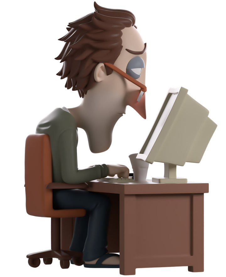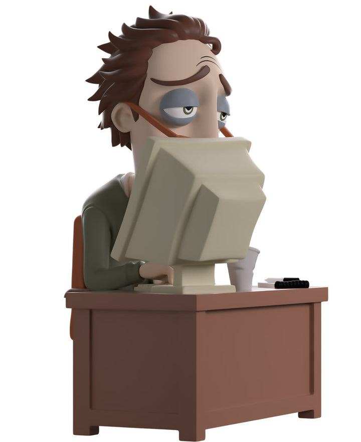 We managed to drag Charlie away from his busy, suuuuper important, work for a Youtooz debut! Wait… Is he working again!? Sitting at 4.7 inches tall and drearily obsessed with his work as he hunches towards the bleak computer monitor on the wooden desk at his front, orange glasses fall down his long nose as his eyebrows raise apathetically over half-lidded eyes and messy brown hair is slicked back. Wearing a mossy green sweater and blue jeans along with sandals, his slumped posture really emphasizes how truly exhausted he is. The exterior of his packaging sees him gloomily working away in a pale-lit room, while the light green interior is covered in a pattern of bugs and vines. The protective sleeve is then pitch black with white stitching running around it as her figure can be seen through the large clear window at the packaging’s front. This collectible ships in a matte, embossed, protective outer sleeve and a custom-sized plastic protector for maximum protection during shipping.